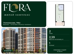 Жилой комплекс ''FLORA'' - проект комфорт-класса, расположенный в одном из самых привлекательных и зелёных районов Воронежа на улице Ломоносова. Государственный природный заповедник, множество образовательных учреждений с качественным уровнем обучения, большой коммерческий фронт для развития малого и среднего бизнеса, центры здоровья и спорта всё это располагается в шаге от жилого комплекса. А свободный доступ к главным городским автомагистралям и транспортным развязкам позволит быть мобильными и смело прокладывать маршруты в любую точку города на автомобиле или общественном транспорте, на велосипеде или пешком.Двор FLORA — это безопасное мультифункциональное пространство для жителей разных возрастов и интересов.Игровые комплексы, установленные на безопасном тартановом покрытии, дарят детям пространство, где они могут быть шумными, активными, неугомонными и желающим изучать мир во всех его проявлениях.Для тех, кто предпочитает активный образ жизни, в жилом комплексе FLORA предусмотрено workout-пространство на свежем воздухе. Продуманные планировочные решения квартир в жилом комплексе FLORA полностью отвечают потребностям жизни современных городских жителей:- комфортные студии отличный выбор для амбициозных студентов - просторные однокомнатные квартиры с гардеробными комнатами для молодых семей- двух и трёхкомнатные квартиры c гардеробными и двумя санузлами для семей с детьмиВвод в эксплуатацию запланирован в 4 квартале 2029 года согласно проектной документации.Покупая квартиру в ЖК ''FLORA'' от ГК Развитие, вы получаете дополнительно БЕСПЛАТНО:- помощь в одобрении и получении ипотеки с минимальной процентной ставкой.- ПОЛНОЕ ЮРИДИЧЕСКОЕ СОПРОВОЖДЕНИЕ сделки купли-продажи- Помощь в реализации МАТЕРИНСКОГО капитала.- Консультация и показ объекта в любое УДОБНОЕ ВРЕМЯ- Помощь в ПОДГОТОВКЕ И СБОРЕ ВСЕХ ДОКУМЕНТОВ, необходимых для покупки.
