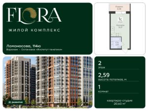 Скидки до 11%, семейная ипотека, рассрочка 0% до 12 месяцев.Жилой комплекс ''FLORA'' - проект комфорт-класса, расположенный в одном из самых привлекательных и зелёных районов Воронежа на улице Ломоносова. Государственный природный заказник, множество образовательных учреждений с качественным уровнем обучения, большой коммерческий фронт для развития малого и среднего бизнеса, центры здоровья и спорта всё это располагается в шаге от жилого комплекса. А свободный доступ к главным городским автомагистралям и транспортным развязкам позволит быть мобильными и смело прокладывать маршруты в любую точку города на автомобиле или общественном транспорте, на велосипеде или пешком.Двор FLORA — это безопасное мультифункциональное пространство для жителей разных возрастов и интересов.Игровые комплексы, установленные на безопасном тартановом покрытии, дарят детям пространство, где они могут быть шумными, активными, неугомонными и желающим изучать мир во всех его проявлениях.Для тех, кто предпочитает активный образ жизни, в жилом комплексе FLORA предусмотрено workout-пространство на свежем воздухе. Продуманные планировочные решения квартир в жилом комплексе FLORA полностью отвечают потребностям жизни современных городских жителей:- комфортные студии отличный выбор для амбициозных студентов - просторные однокомнатные квартиры с гардеробными комнатами для молодых семей- двухкомнатные квартиры c гардеробными и двумя санузлами для семей с детьмиВвод в эксплуатацию запланирован в 4 квартале 2029 года согласно проектной документации.Покупая квартиру в ЖК ''FLORA'' от ГК Развитие, вы получаете дополнительно БЕСПЛАТНО:- помощь в одобрении и получении ипотеки с минимальной процентной ставкой.- ПОЛНОЕ ЮРИДИЧЕСКОЕ СОПРОВОЖДЕНИЕ сделки купли-продажи- Помощь в реализации МАТЕРИНСКОГО капитала.- Консультация и показ объекта в любое УДОБНОЕ ВРЕМЯ- Помощь в ПОДГОТОВКЕ И СБОРЕ ВСЕХ ДОКУМЕНТОВ, необходимых для покупки.