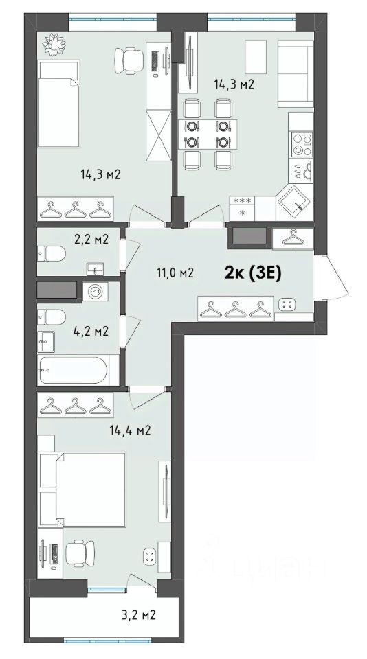 21 м² · Этаж 14 из 19