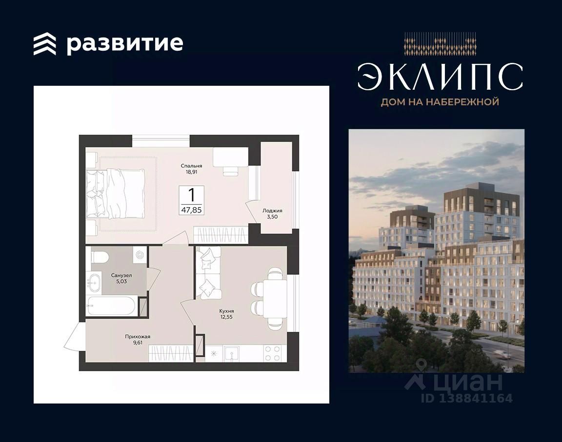 Продаётся 1-комнатная квартира в строящемся доме (Эклипс), срок сдачи: III-кв. 2030, общей площадью 47.85 кв.м., на 8 этаже. Новый жилой комплекс от группы компаний ''Развитие'' расположен по адресу: г. Воронеж, набережная Массалитинова.