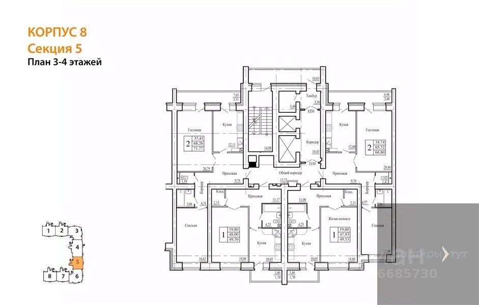 Квартира: 2 к 69,42 кв.м., 13 этаж в комплексе Зеленая долина, 5 очередь, корп.8 (секции 7, 8), сдача: 4кв. , этажей: 14, адрес Воронеж г., Здоровья пер., , Застройщик: Электронжилсоцстрой.