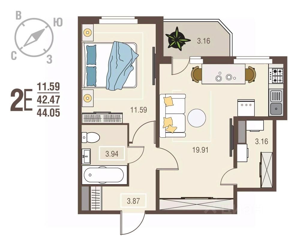 Общая площадь44,05 м2