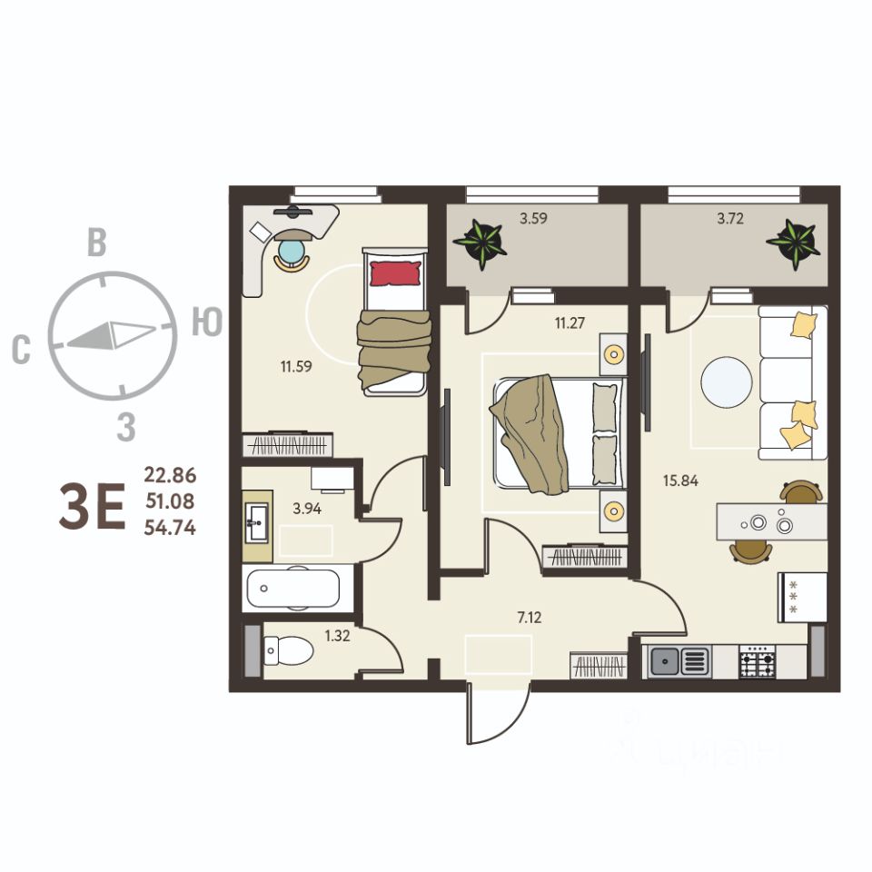 Общая площадь54,74 м2