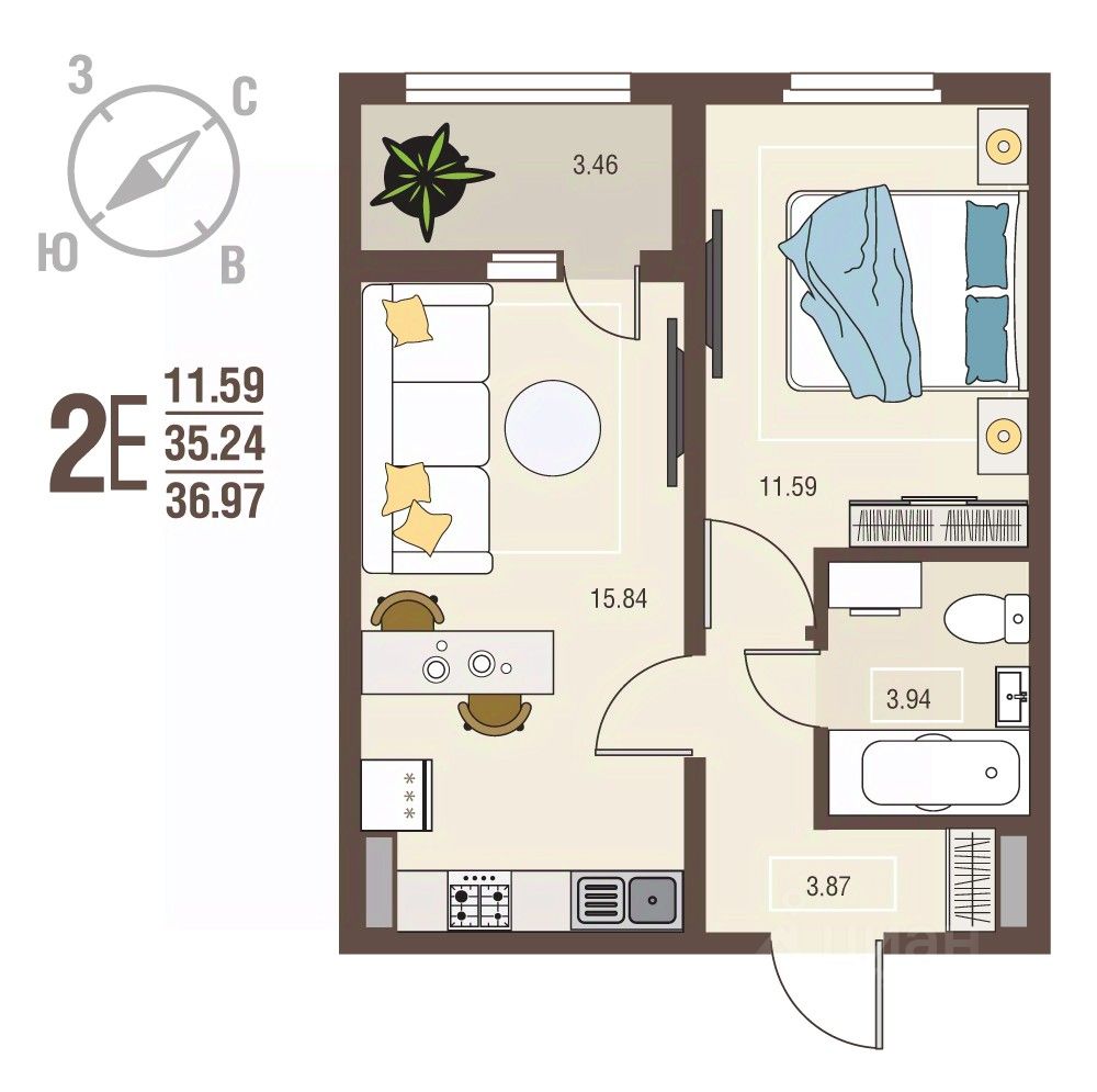 Общая площадь36,97 м2