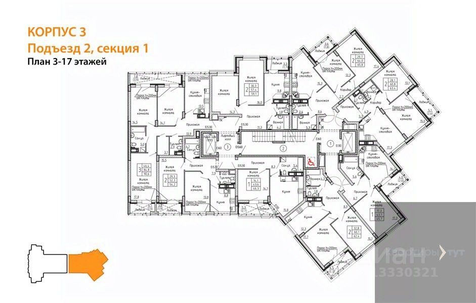 Квартира: 2 к 63,40 кв.м., 15 этаж в комплексе Европейский, 2 очередь, корп.3, сдача: 4кв. , этажей: 24, адрес Воронеж г., Красных партизан ул., д. 35, Застройщик: ДСК.