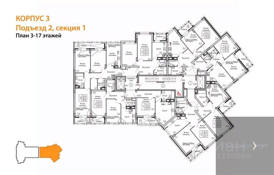 Квартира: 2 к 63,40 кв.м., 17 этаж в комплексе Европейский, 2 очередь, корп.3, сдача: 4кв. , этажей: 24, адрес Воронеж г., Красных партизан ул., д. 35, Застройщик: ДСК.