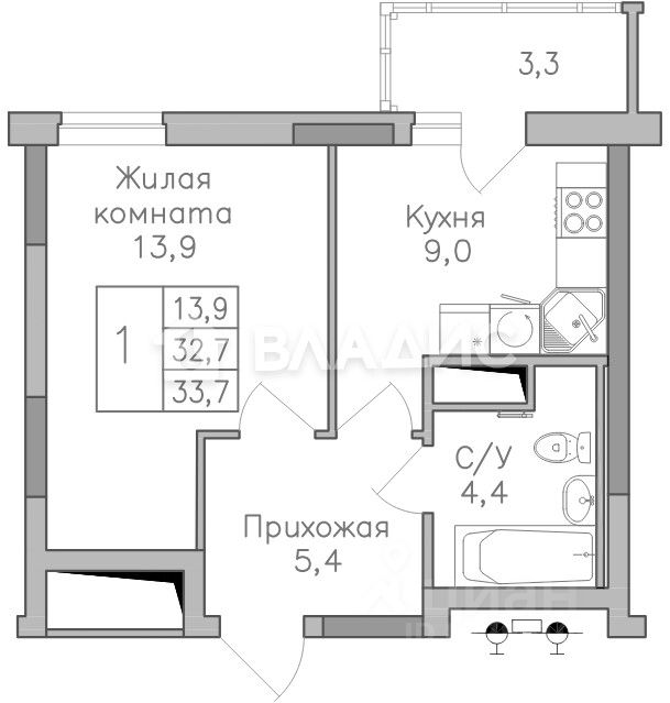 Общая площадь33,7 м2