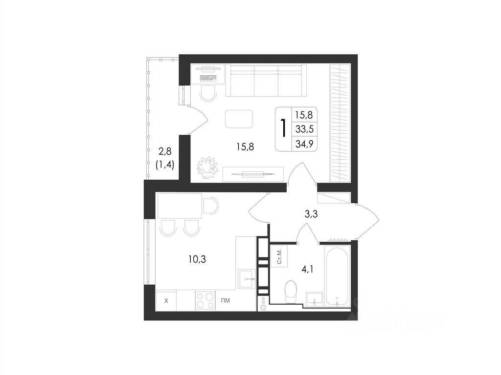 Общая площадь34,9 м2