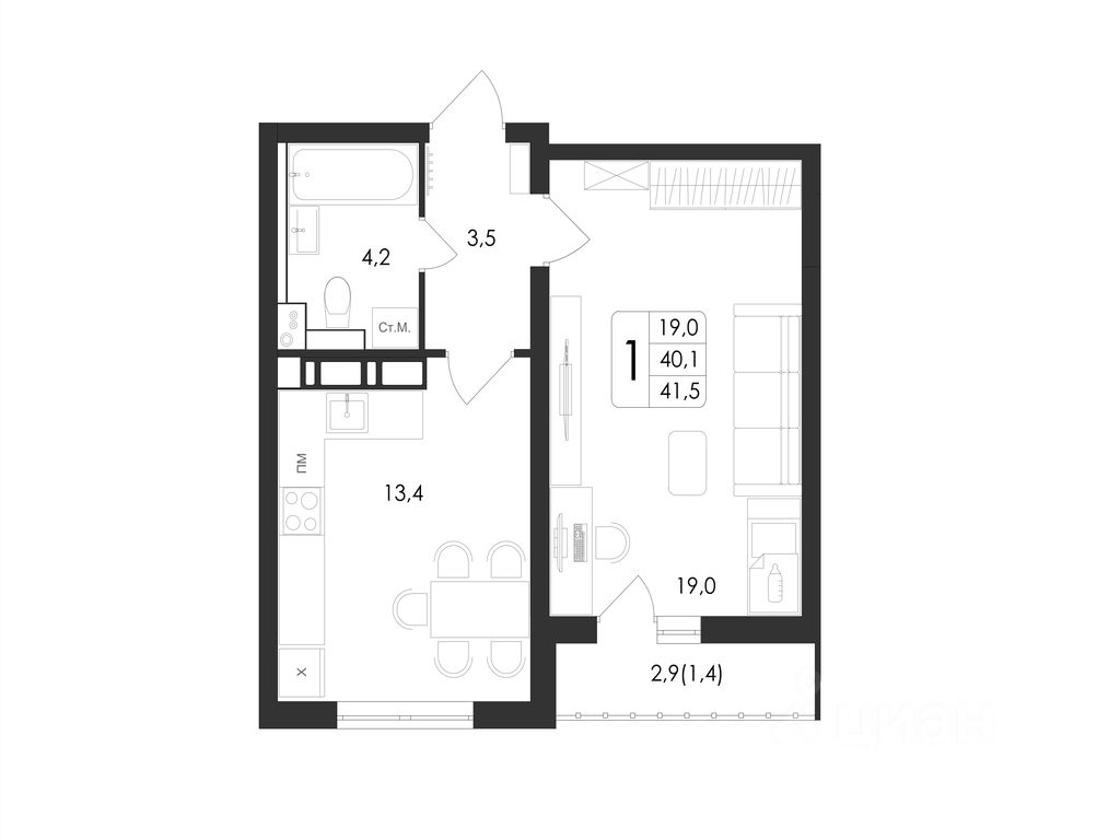 Общая площадь41,5 м2