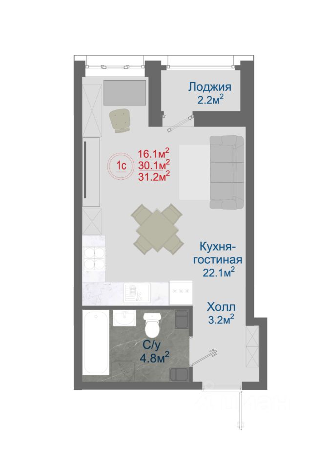 Квартира, где есть всё что нужно: небольшая прихожая, санузел удобной прямоугольной формы, широкая жилая комната-кухня с компактной лоджией. Увеличенные видовые окна, ПСК 4.6%19.9%.