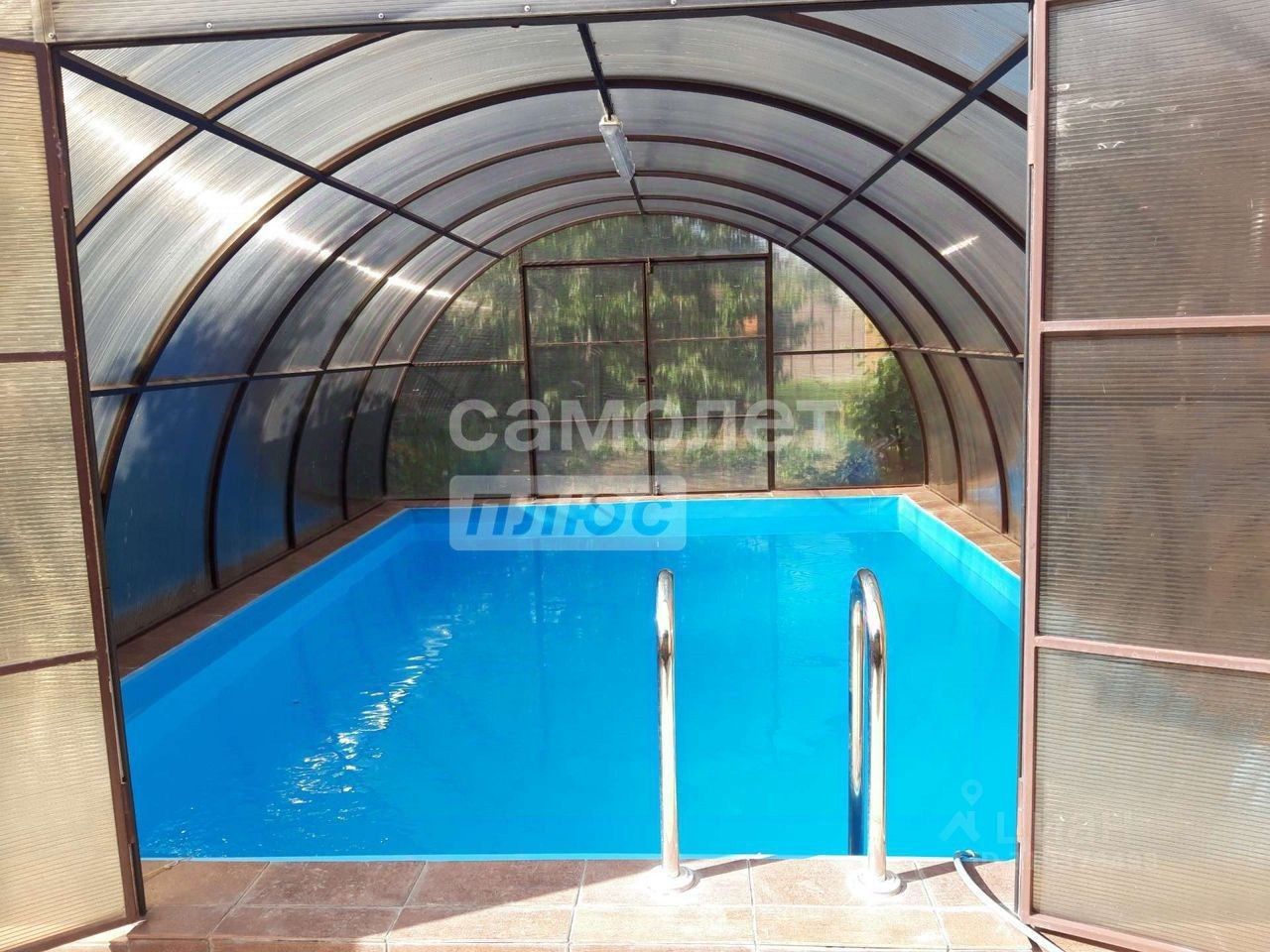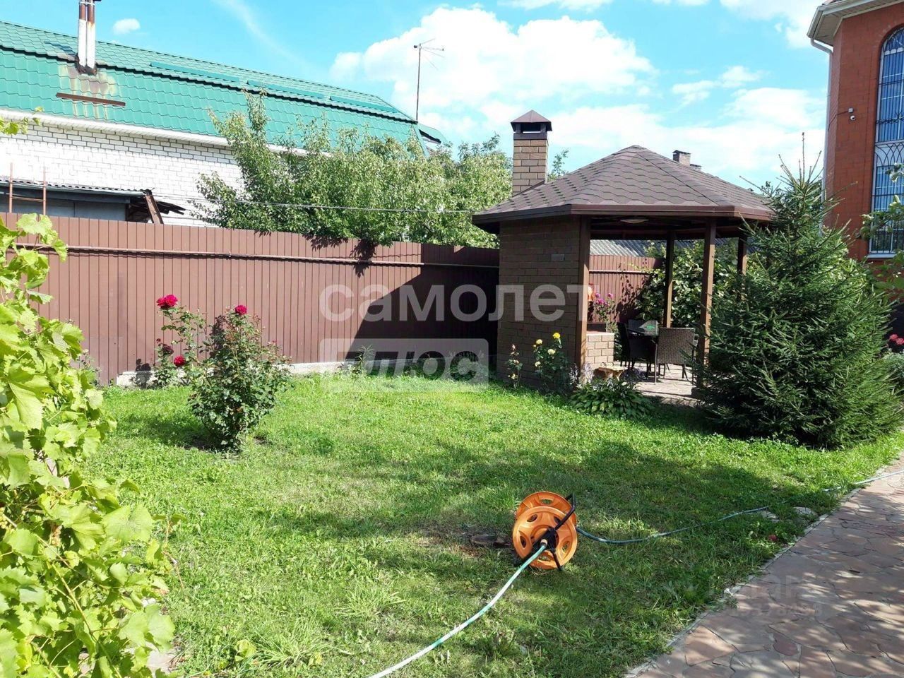 Участок 10 соток, ровный, ухоженный, прямоугольной формы, по периметру огорожен забором. Двор уложен плиткой, постелен газон. Подъезд к участку - асфальтированная дорога. Имеются хоз. постройки: русская баня, беседка с зоной мангала, гараж на 2 автомобиля. Открытый бассейн на территории.