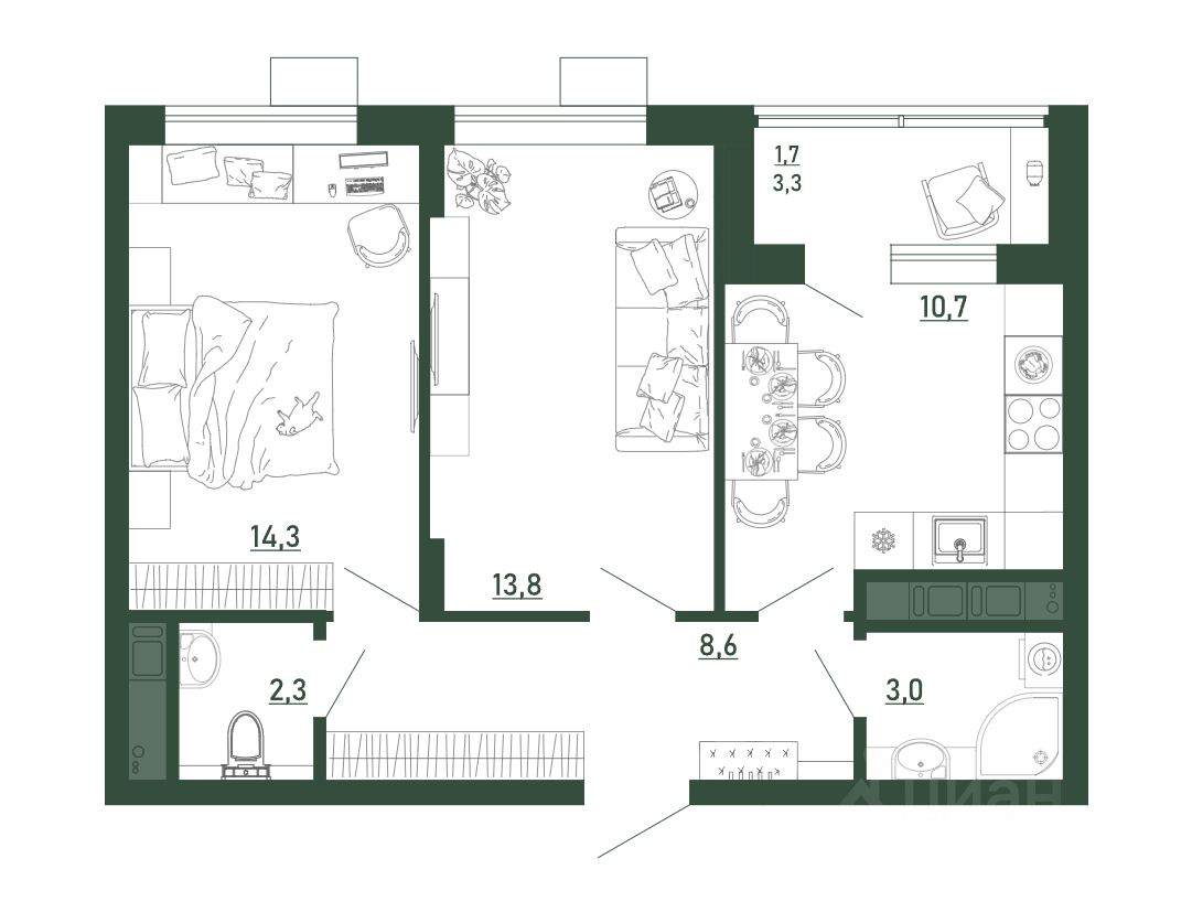 Общая площадь54,4 м2
