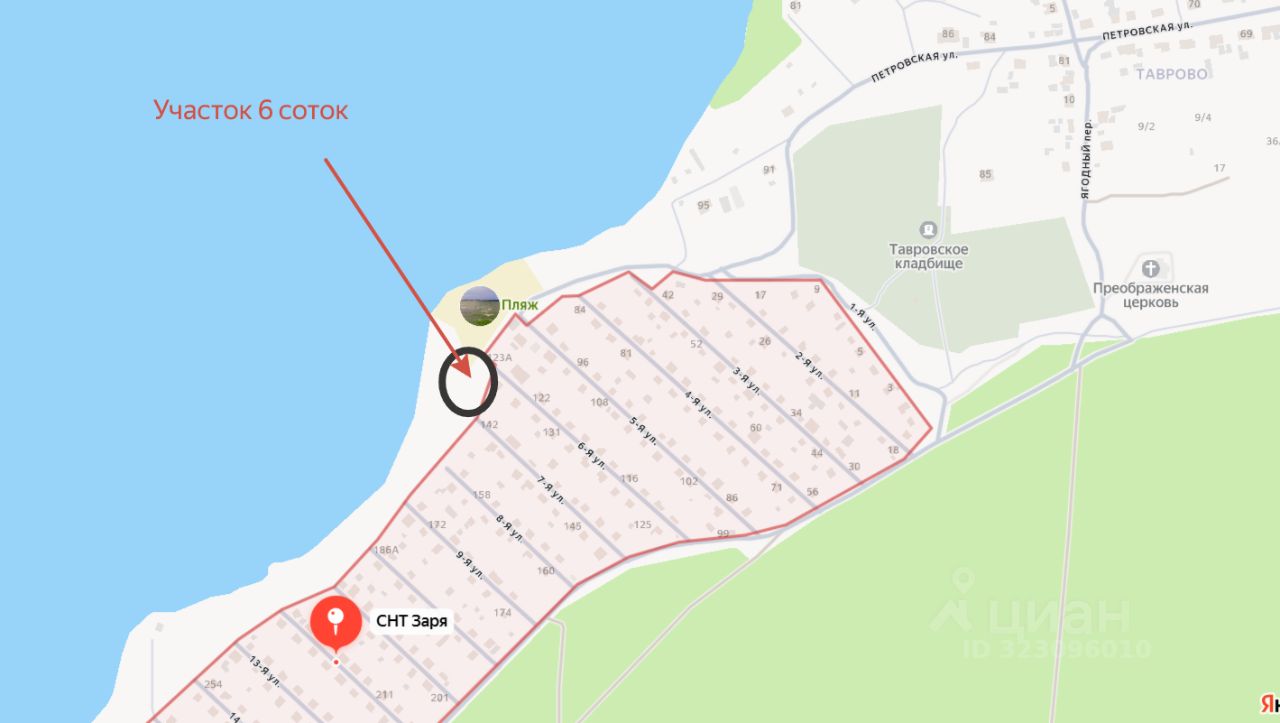 На первой береговой линии СНТ Заря продается земельный участок 6 соток. Участок имеет вид разрешенного строительства: для ведения садоводства, что позволяет построить жилой дом с возможностью круглогодичного проживания и прописки.