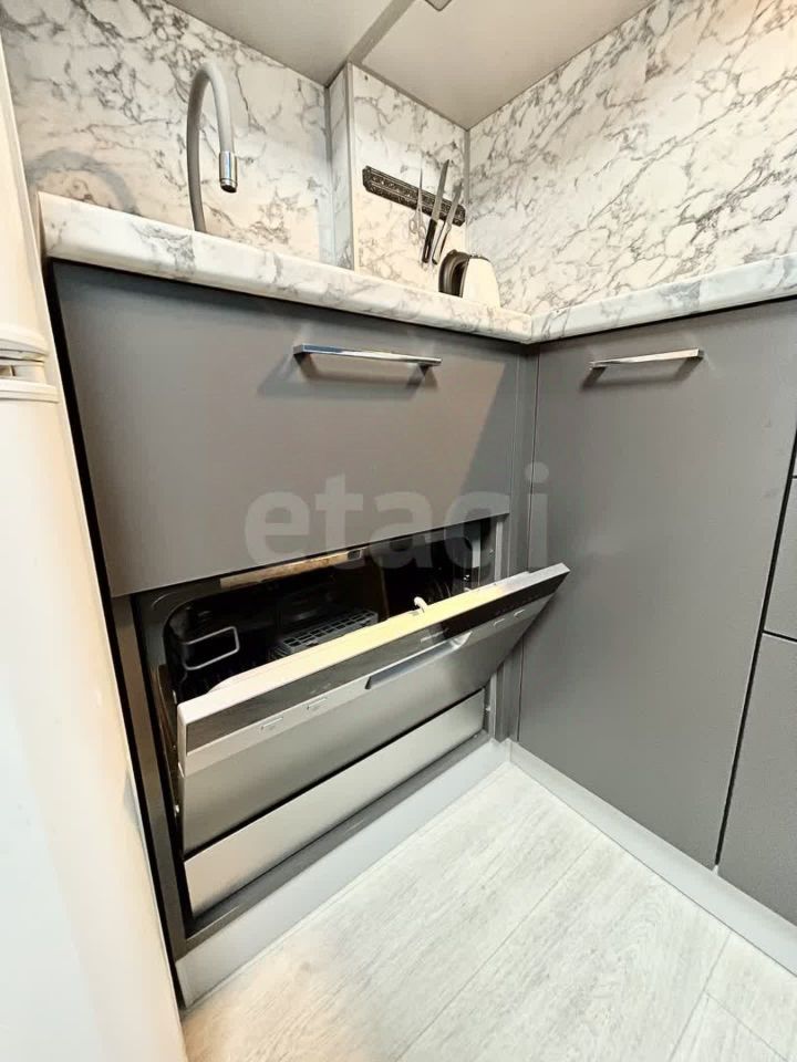 В квартире имеется просторная жилая комната с совмещенной кухней, в которой установлены необходимая мебель и техника для комфортного проживания: диван, большой шкаф, кондиционер , рабочий стол со стулом, холодильник, микроволновка, электрический чайник, электрическая плита, электрический духовой шкаф, посудомоечная машина, кухонный гарнитур, стол, стулья.