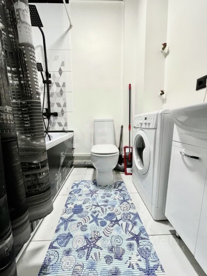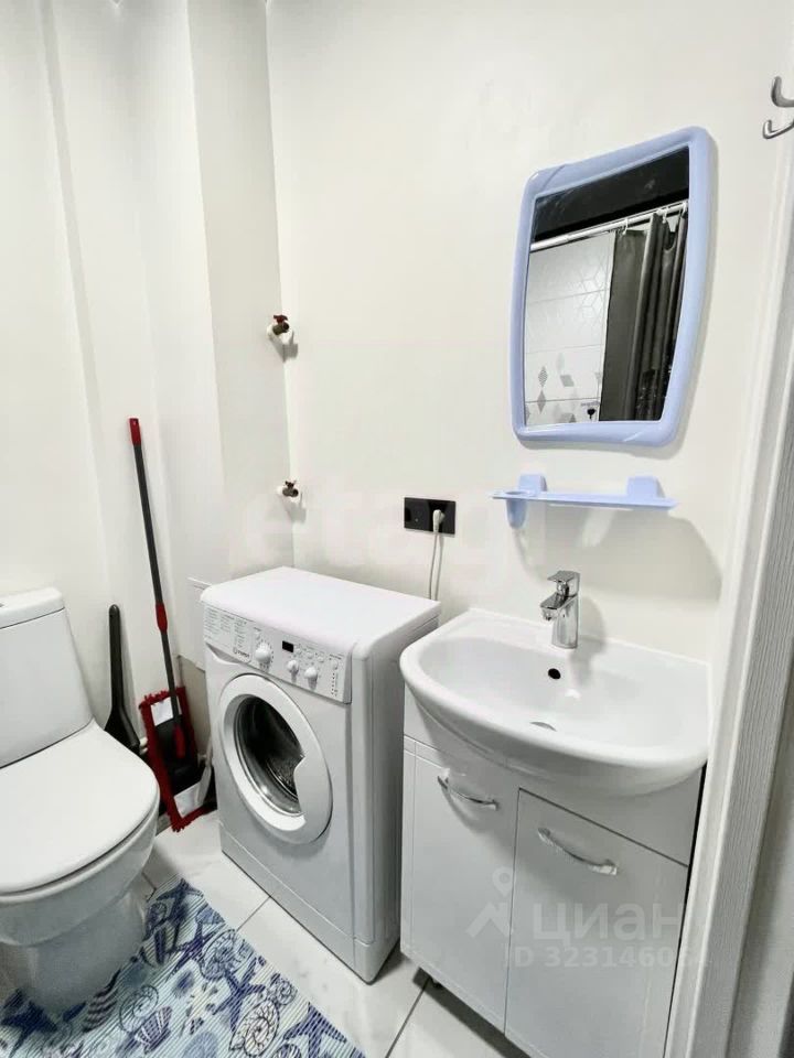 Санузел совмещен: унитаз, ванная с с тропическим душем, стиральная машина, зеркало, умывальник.
