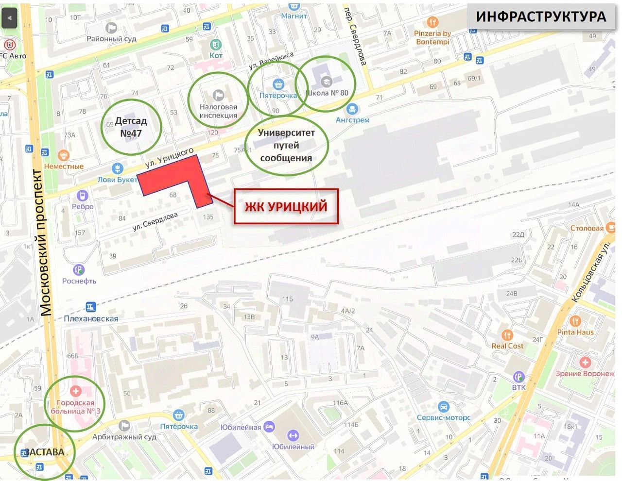 У дома спроектирована дворовая территория с авторским озеленением, игровыми и спортивными площадками и зонами отдыха. В пешеходной доступности от жилого комплекса находятся образовательные и социальные учреждения, магазины, аптеки. Хорошая транспортная развязка. Проехать несколько остановок на общественном транспорте - и вы в самом центре Воронежа.
