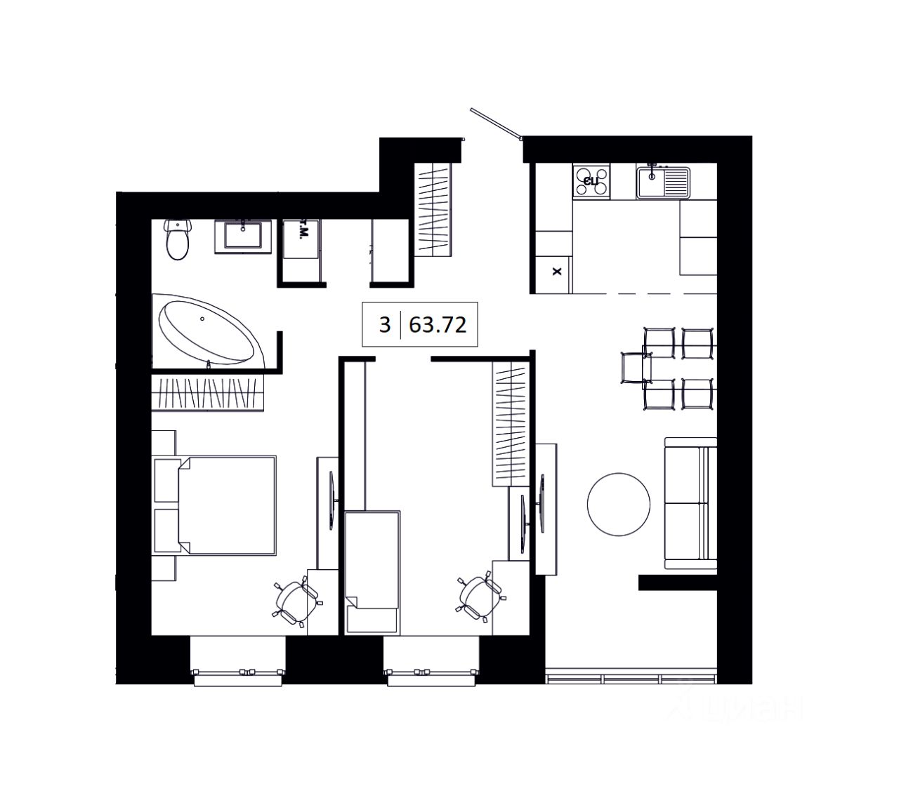 Общая площадь63,72 м2