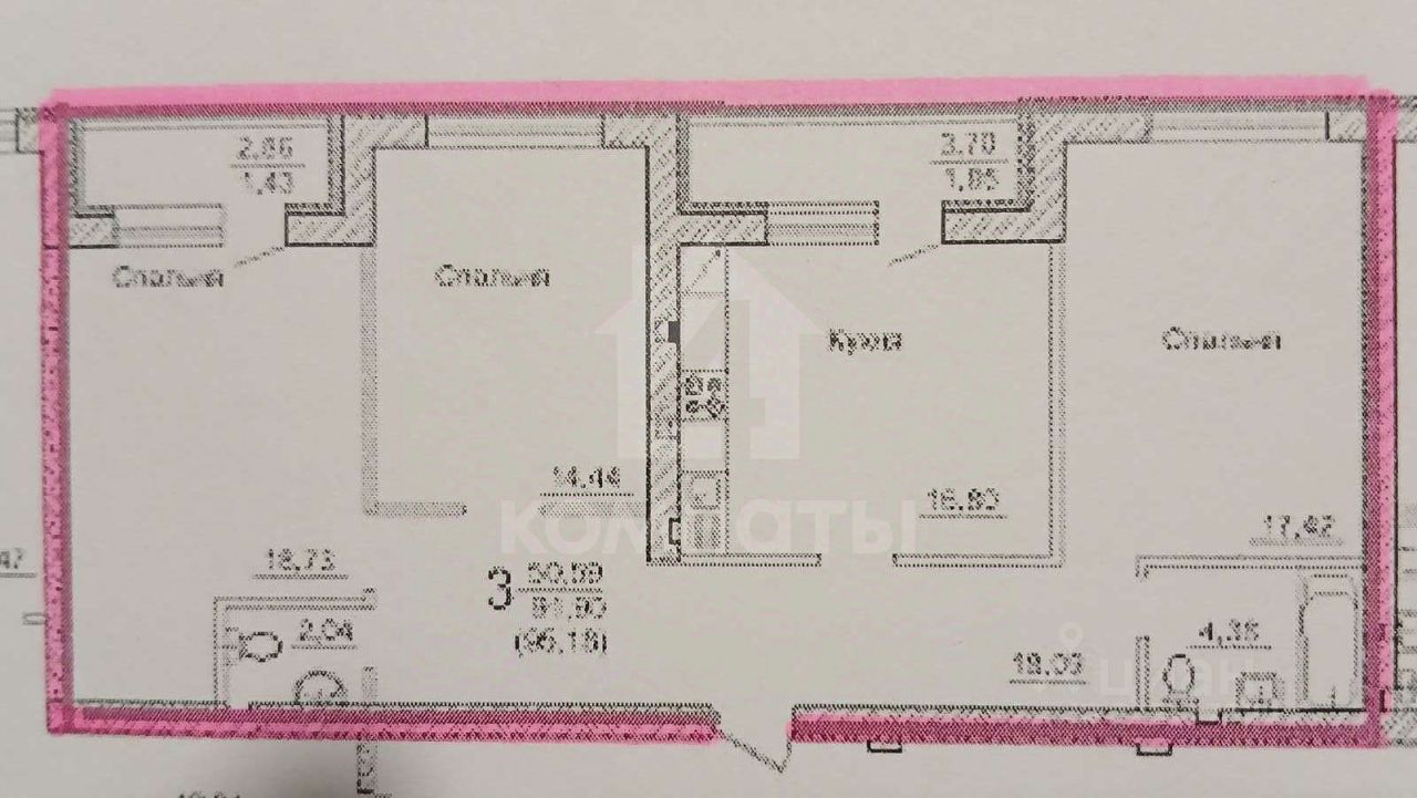 В квартире: три комнаты - 19, 17,5 и 14,5 кв.м., шикарная кухня квадратной формы - 17 кв.м., коридор - 18кв.м., санузел, облицованный современной плиткой, - 4,5 кв.м., две лоджии 4 и 3 кв.м.