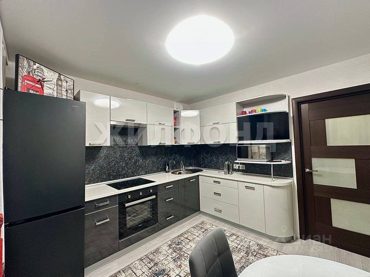В подарок новым владельцам остается кухонный гарнитур со встроенной техникой (варочная панель, духовой шкаф, вытяжка).