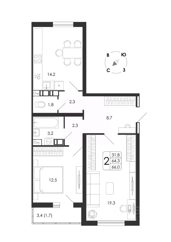 Общая площадь66 м2