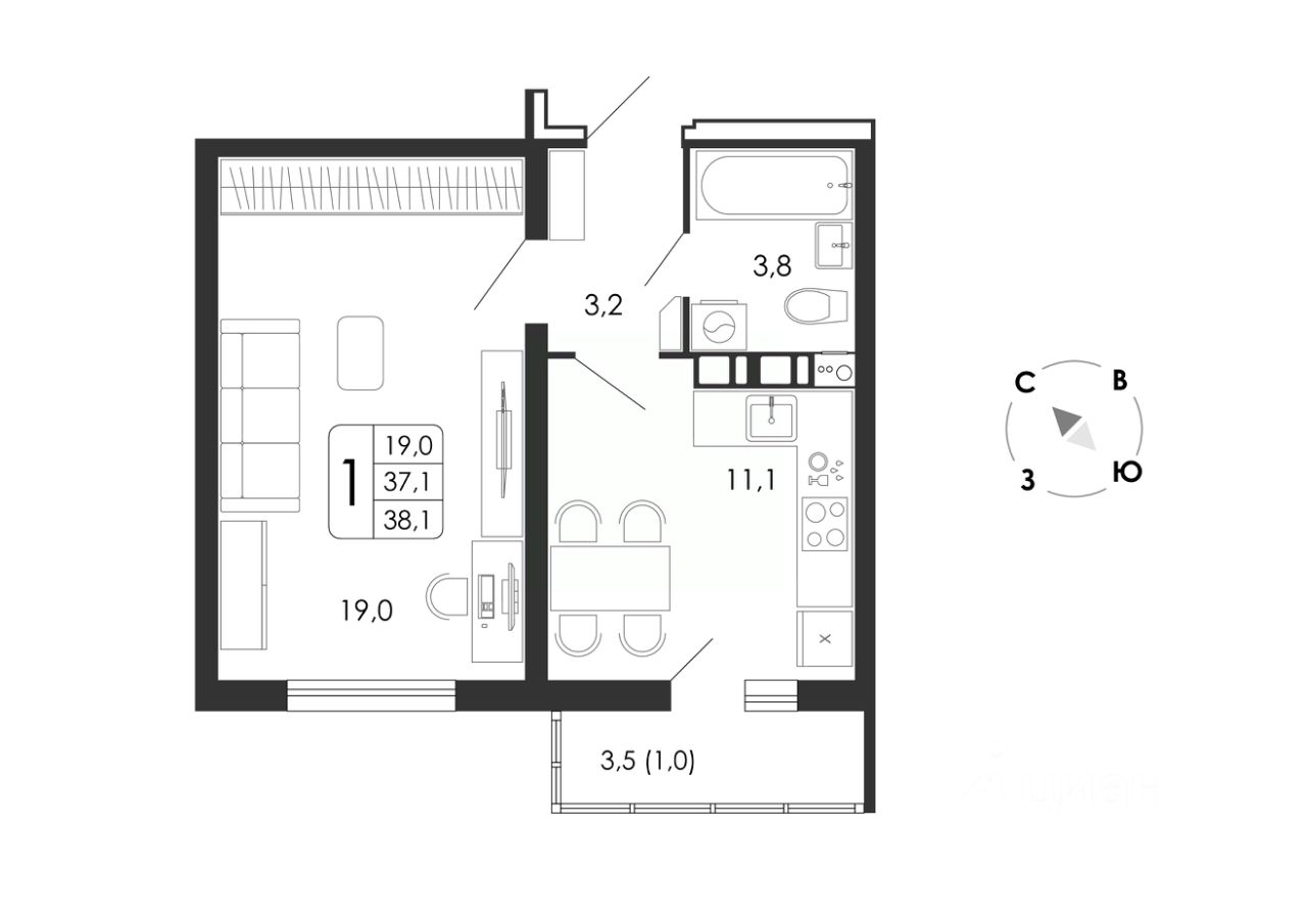 Общая площадь38,1 м2