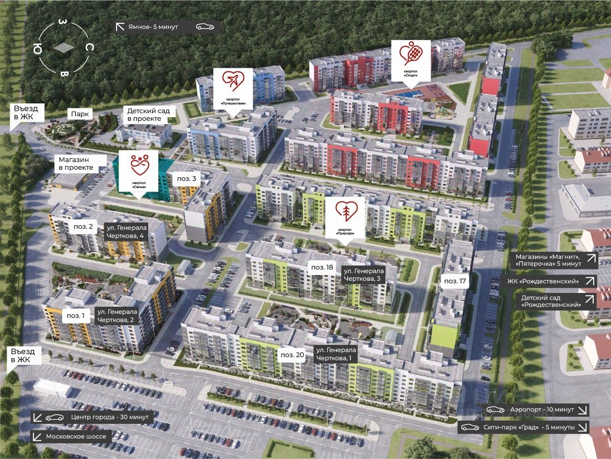 - Проектом предусмотрено 14 жилых домов (4 уже сданы) с использованием технологии объемно-блочного домостроения - Комплекс из 7-ми этажных жилых домов - Квартиры с чистовой и черновой отделкой - Лоджии с панорамным остеклением - Надежная тепло- и звукоизоляция - Входы в подъезды с панорамным остеклением, расположены на уровне земли - Проектом предусмотрены детский сад, магазин и собственный парк - Важные объекты социальной инфраструктуры рядом: детский сад ''Рождественский'', супермаркеты, сити-парк ''Град'', ''Леруа Мерлен'', физкультурно-оздоровительные комплексы и конноспортивный клуб - Система видеонаблюдения и возможность дистанционного управления домофоном со смартфона - Новая школа в п. Ямное в 10 минутах езды - Тематическая концепция благоустройства - 4 тематических квартала с целью создания сбалансированной среды для жизни: кварталы семья, спорт, природа и путешествия. - Безбарьерная среда по всей территории - Остановки общественного транспорта и удобный выезд на Московское шоссе - 5 минут езды от сити-парка ''Град'', 30 минут - до центра города на авто
