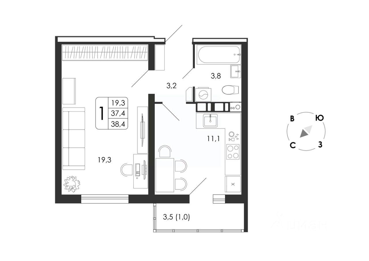Общая площадь38,4 м2