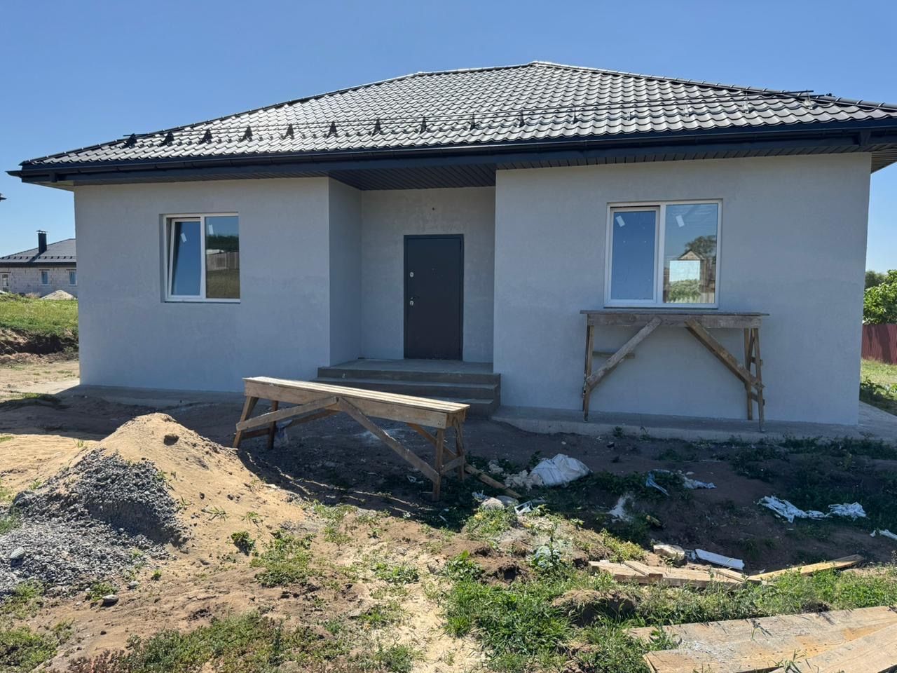 -Площадь дома: 76,53 м2. Просторная кухня-гостинная- 21,46, спальня- 14,29 и 13,64. - Площадь участка: 7,5 соток - 2 спальни + кухня-гостиная - терраса по договоренности - стены: газосиликат, облицовка короед - ровная гипсовая штукатурка - коммуникации все подключены: газ и эл/ энергия - водоснабжение централизованное - сливная яма: 3 кольца, диаметр 1,5 метра. Наружные двери стальные по ГОСТ 31173-2016, Крыша- металлочерепица утеплитель- 100. Фундамент- ленточный, бетонный. Отмостка (защита фундамента от дождевых вод) Окна металлопластиковые по ГОСТ 3064-99. Звоните по интересующим вопросам с 8 до 22:00 Помощь в одобрении ипотеки! Полное сопровождение сделки. Подходит под все ипотеки, сельская под 3%.
