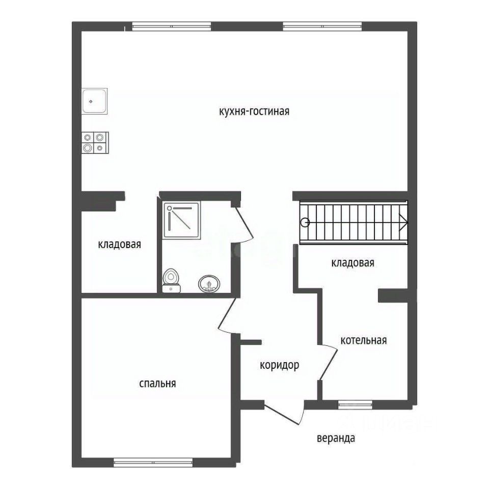 Первый этаж включает просторную кухню-гостиную 32,4 кв.м, спальню 14,4 кв.м, санузел, холл 8,5 кв.м, котельную 5,64 кв.м, подсобное помещение с выходом из кухонной зоны, гардеробную в лестничной зоне и веранду 6 кв.м.