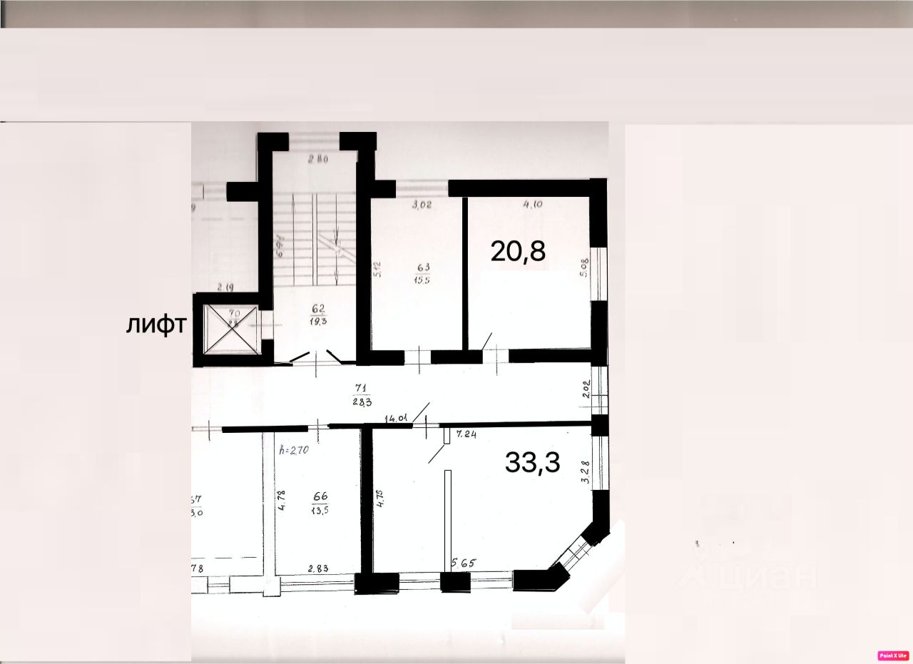 Состоит из двух рядом расположенных кабинетов 33,3 и 20,8 м/кв