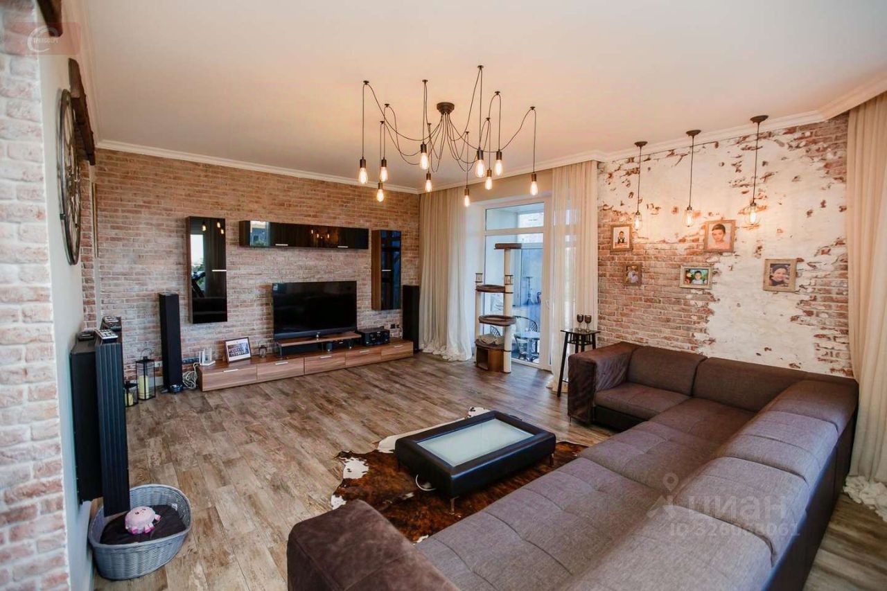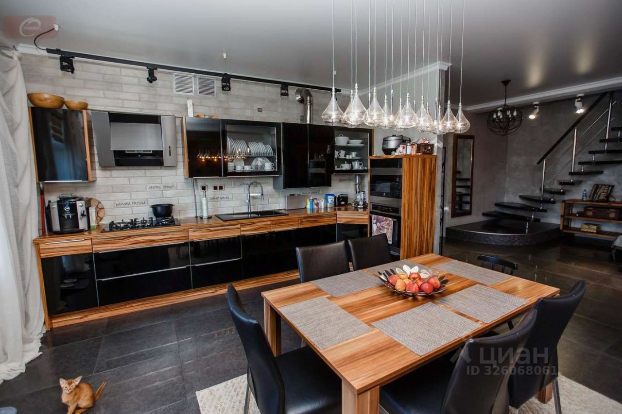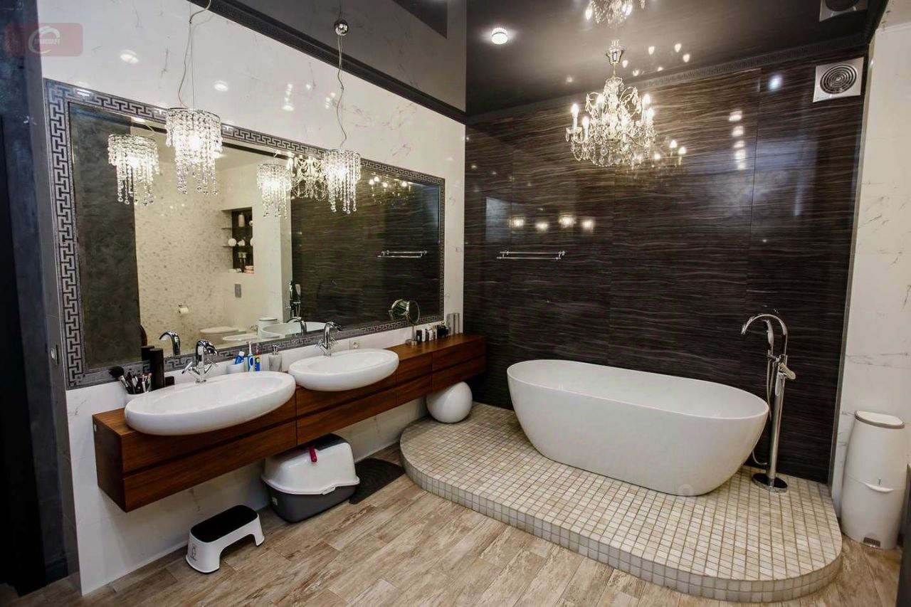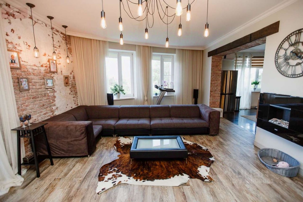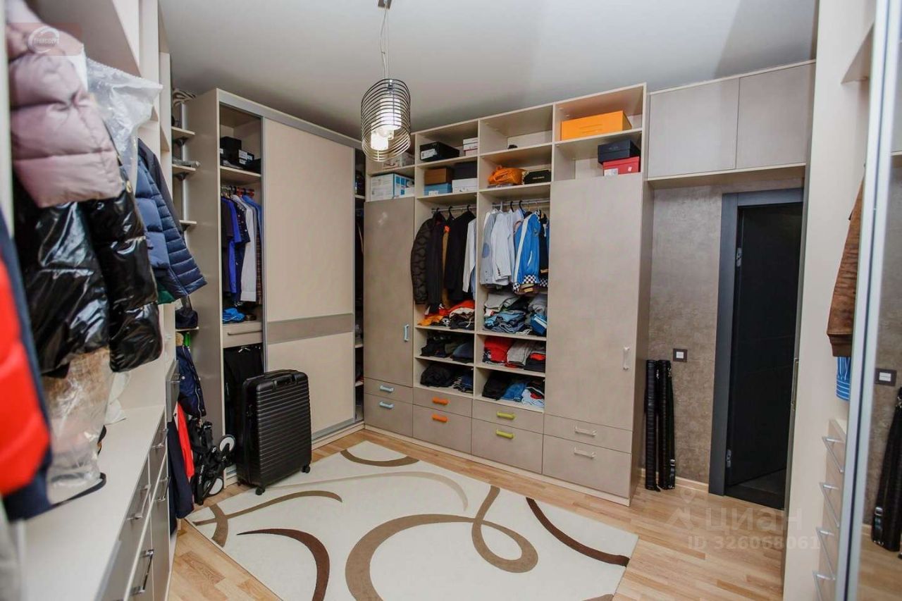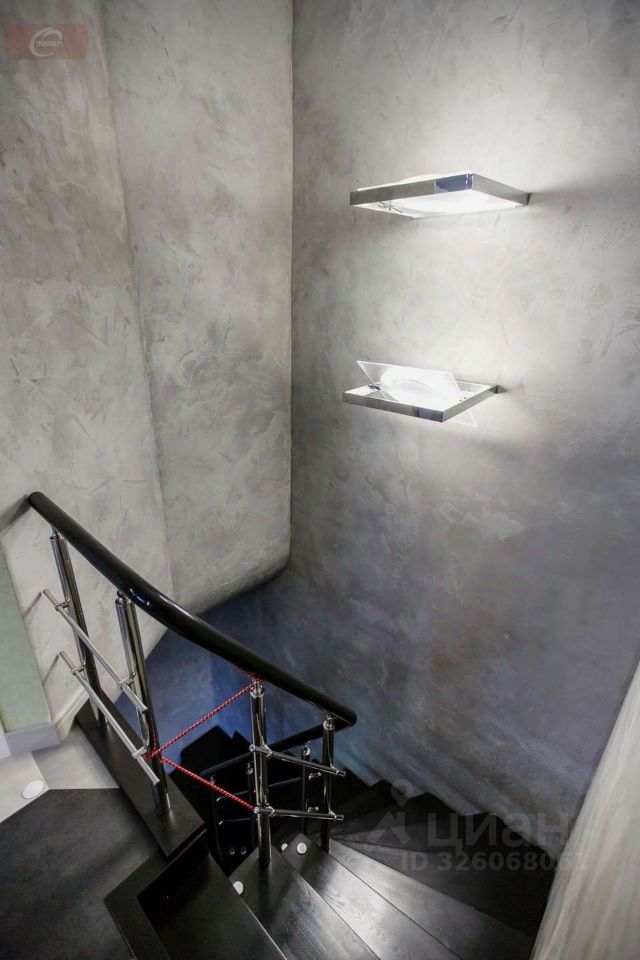 -На первом этаже находится кухня- гостиная (53 кв. мет.), гардеробная (16 кв. мет.), ванная комната (10 кв. мет.) с выходом в спальню (25 кв. мет.), а так же 2 балкона и 1 лоджия. Высота потолков- 2,95 м. На втором этаже три стилизованные детские комнаты: пиратская (24 кв. мет.) с гардеробной (10 кв. мет.) футбольная (29 кв. мет.) с душевой, подсобным помещением и город будущего (24 кв. мет.). Высота потолков- 2,9 метра. -Мебель выполнена из деревянного шпона, межкомнатные двери- дерево со стеклянными вставками. Лестница между первым и вторым этажом из ясеня. Авторская штукатурка и художественная роспись потолков и стен.