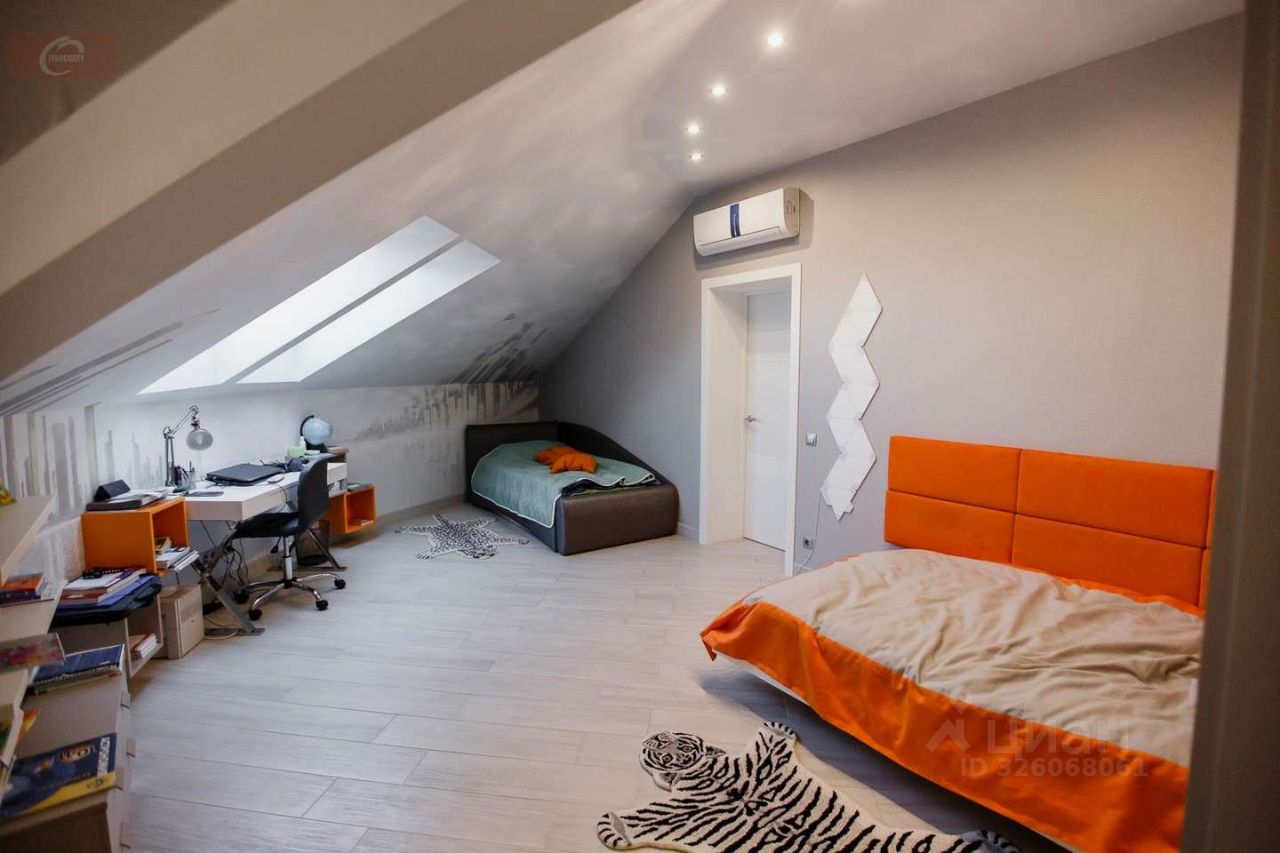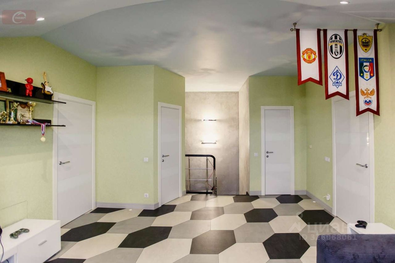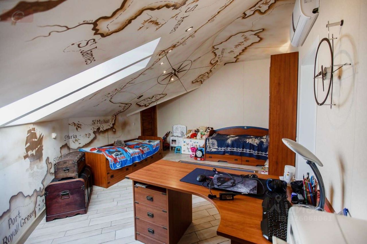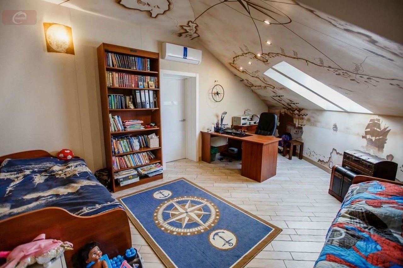-На первом этаже находится кухня- гостиная (53 кв. мет.), гардеробная (16 кв. мет.), ванная комната (10 кв. мет.) с выходом в спальню (25 кв. мет.), а так же 2 балкона и 1 лоджия. Высота потолков- 2,95 м. На втором этаже три стилизованные детские комнаты: пиратская (24 кв. мет.) с гардеробной (10 кв. мет.) футбольная (29 кв. мет.) с душевой, подсобным помещением и город будущего (24 кв. мет.).