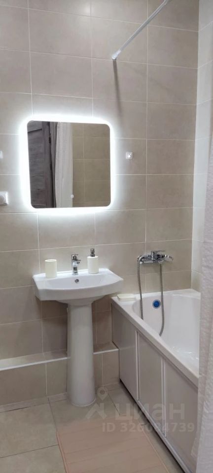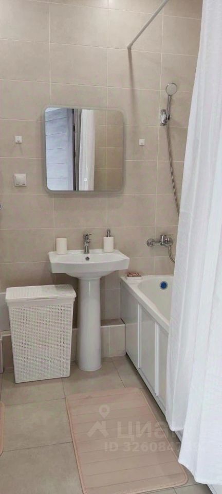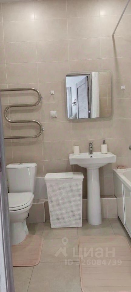 Кухня оснащена современной техникой: холодильник, варочная поверхность, духовой шкаф, вытяжка, микроволновая печь, мультиварка, электрический чайник. Санузел совмещённый, светлый, с ванной и стиральной машиной.