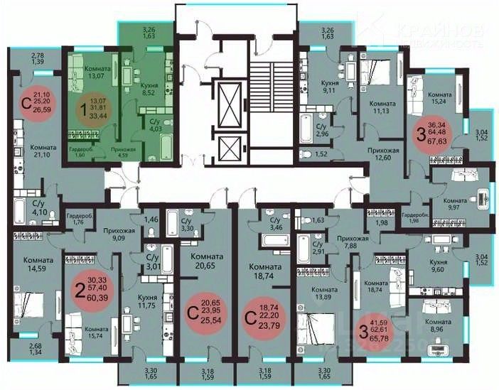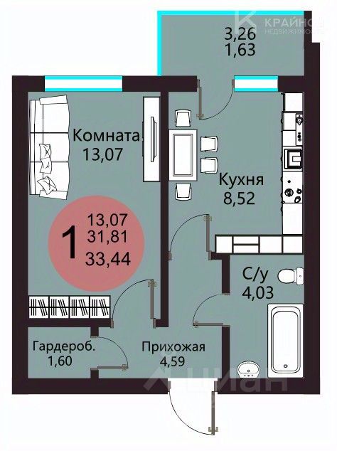 Площадь:Общая 33,44 м², комната 13,07 м², просторная кухня с выходом на балкон 8,52 кв.м, санузел 4,03 кв.м, гардеробная 1,6 м²