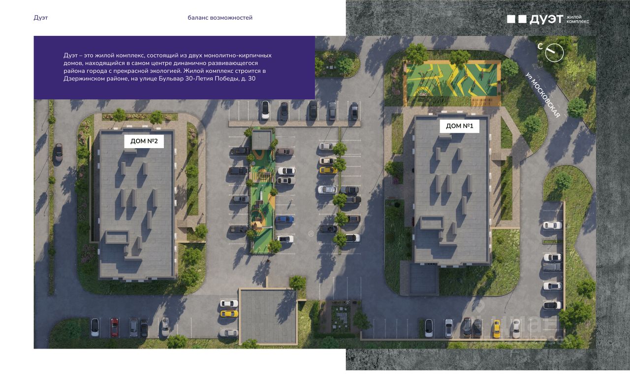 Дуэт — двойное удовольствие от жизни. В ипотеку от 5 %* Новый жилой комплекс в Дзержинском районе, на Бульваре 30 -летия Победы, 30. Два 18-этажных дома на благоустроенной территории создают особый ансамбль — ''ДУЭТ'', в котором хочется жить активной жизнью. В архитектурном облике ''ДУЭТА'' воплотились современные градостроительные тенденции. Сочетание благородных природных оттенков в фасадном решении, витражное остекление, корзины под сплит-системы создают стильный и элегантный внешний вид комплекса. Внутридомовая территория ЖК ''ДУЭТ'' — это место, в котором вы будете отдыхать, заниматься спортом, встречаться с друзьями и играть с детьми. Для ценителей здорового образа жизни на территории ЖК предусмотрена спортивная площадка.