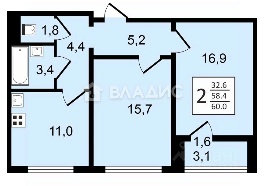 Квартира расположена на 4 этаже 17-этажного панельного дома, построенного в 2025 году. Общая площадь составляет 60 кв. м, из которых 32,6 кв. м — жилая площадь, 11 кв. м — кухня. Высота потолков 2,75 м создаёт ощущение простора и свободы.
