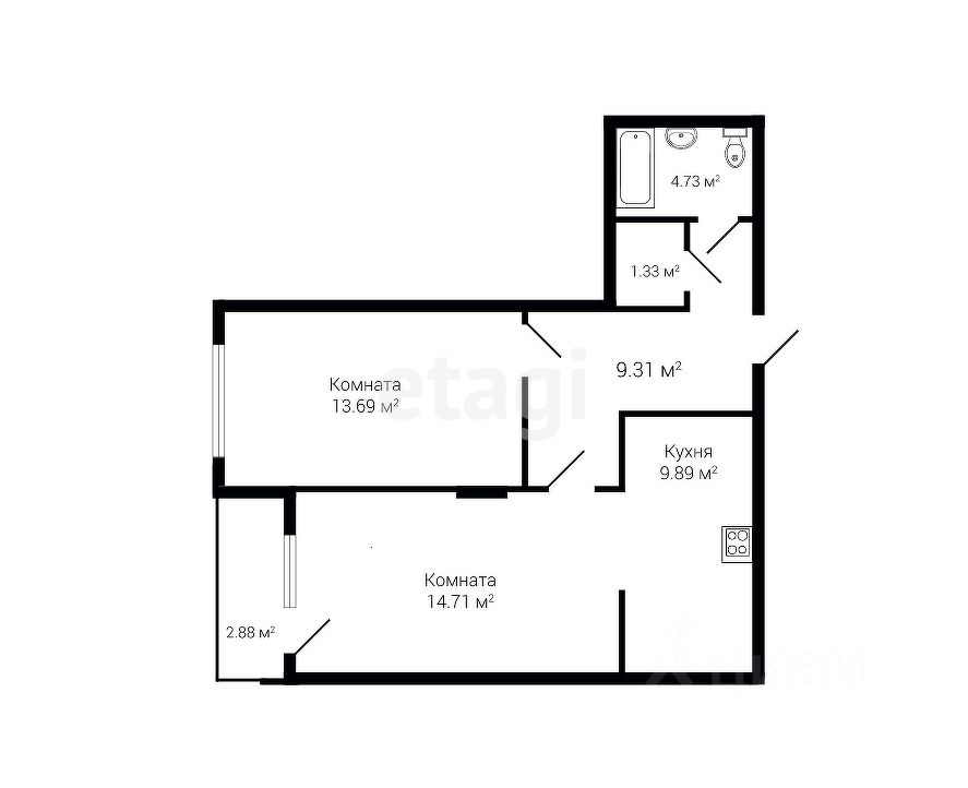 Квартира располагается на 7 этаже. -Общая площадь 55.1 м2, жилая 28,4(13,69+14,71) кв.м -Кухня 9,89 кв.м. -Санузел раздельный 4,73 кв.м. + 1,33 кв.м. -Окна выходят во двор. -Имеется лоджия 2,88 кв.м.