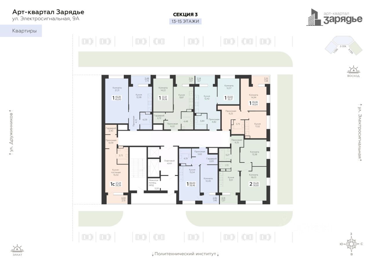 Арт-квартал ''Зарядье'' - это новый микрорайон, который расположен на пересечении улиц Электросигнальной и Дружинников, в 5 минутах ходьбы от остановки Политехнический институт. Арт-квартал возводится в тихой части Коминтерновского района рядом с крупнейшей городской артерией - Московский проспект. Благодаря своему удачному расположению путь до центра города займет всего 10 минут. Помимо транспортной доступности в районе активно развита инфраструктура.