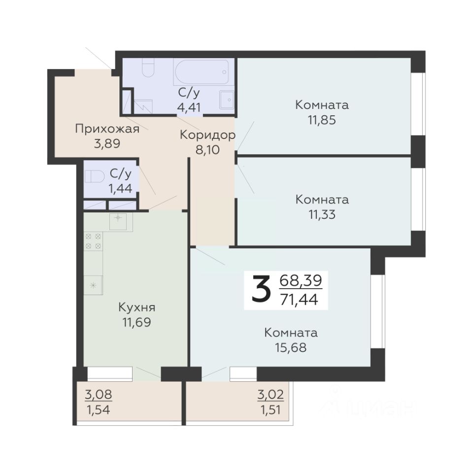 Общая площадь71,44 м2