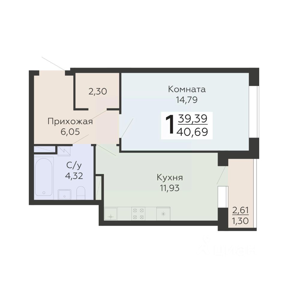 Общая площадь40,69 м2
