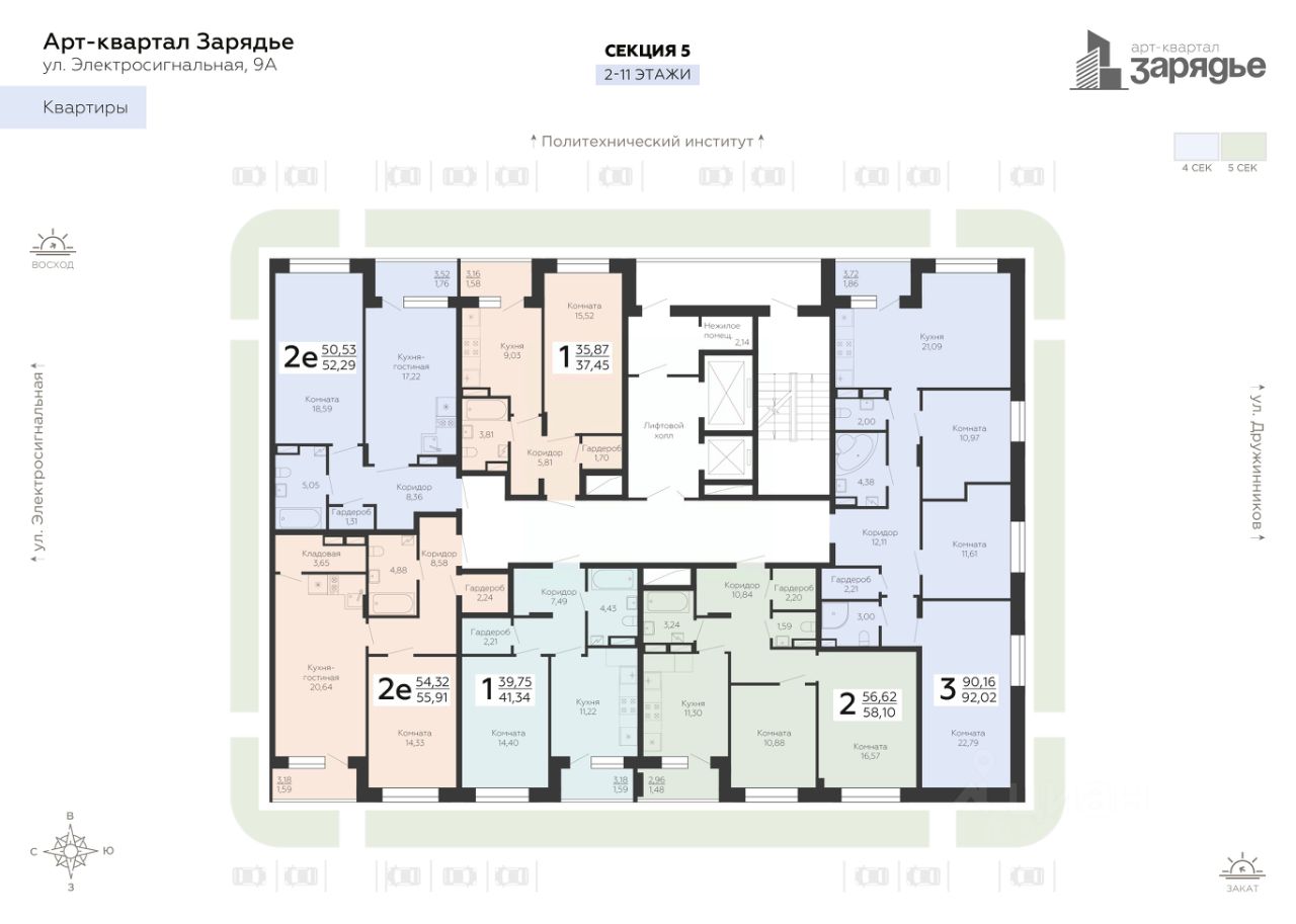 Арт-квартал ''Зарядье'' - это новый микрорайон, который расположен на пересечении улиц Электросигнальной и Дружинников, в 5 минутах ходьбы от остановки Политехнический институт. Арт-квартал возводится в тихой части Коминтерновского района рядом с крупнейшей городской артерией - Московский проспект. Благодаря своему удачному расположению путь до центра города займет всего 10 минут. Помимо транспортной доступности в районе активно развита инфраструктура.