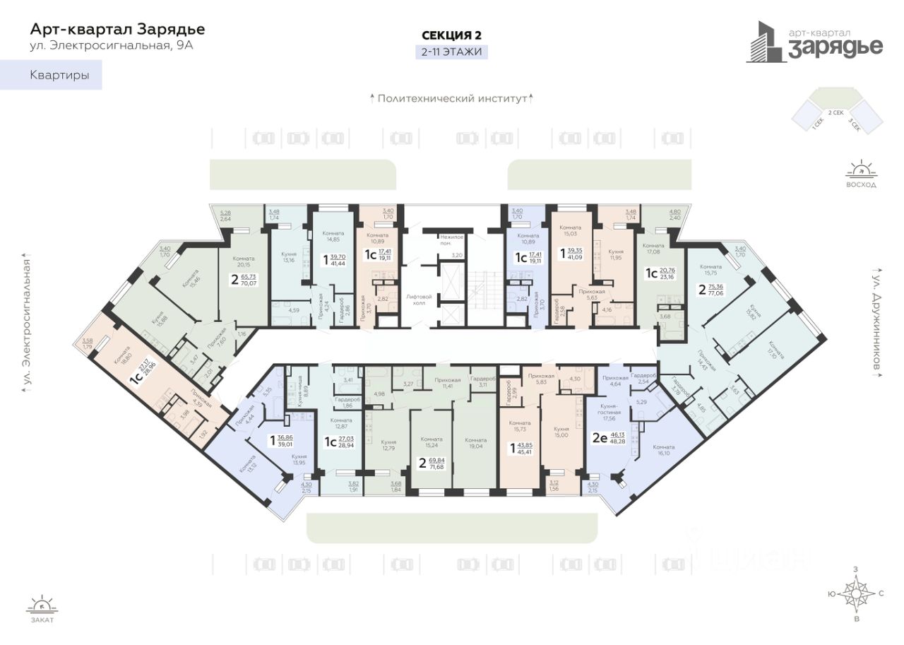 Арт-квартал ''Зарядье'' - это новый микрорайон, который расположен на пересечении улиц Электросигнальной и Дружинников, в 5 минутах ходьбы от остановки Политехнический институт. Арт-квартал возводится в тихой части Коминтерновского района рядом с крупнейшей городской артерией - Московский проспект. Благодаря своему удачному расположению путь до центра города займет всего 10 минут. Помимо транспортной доступности в районе активно развита инфраструктура.