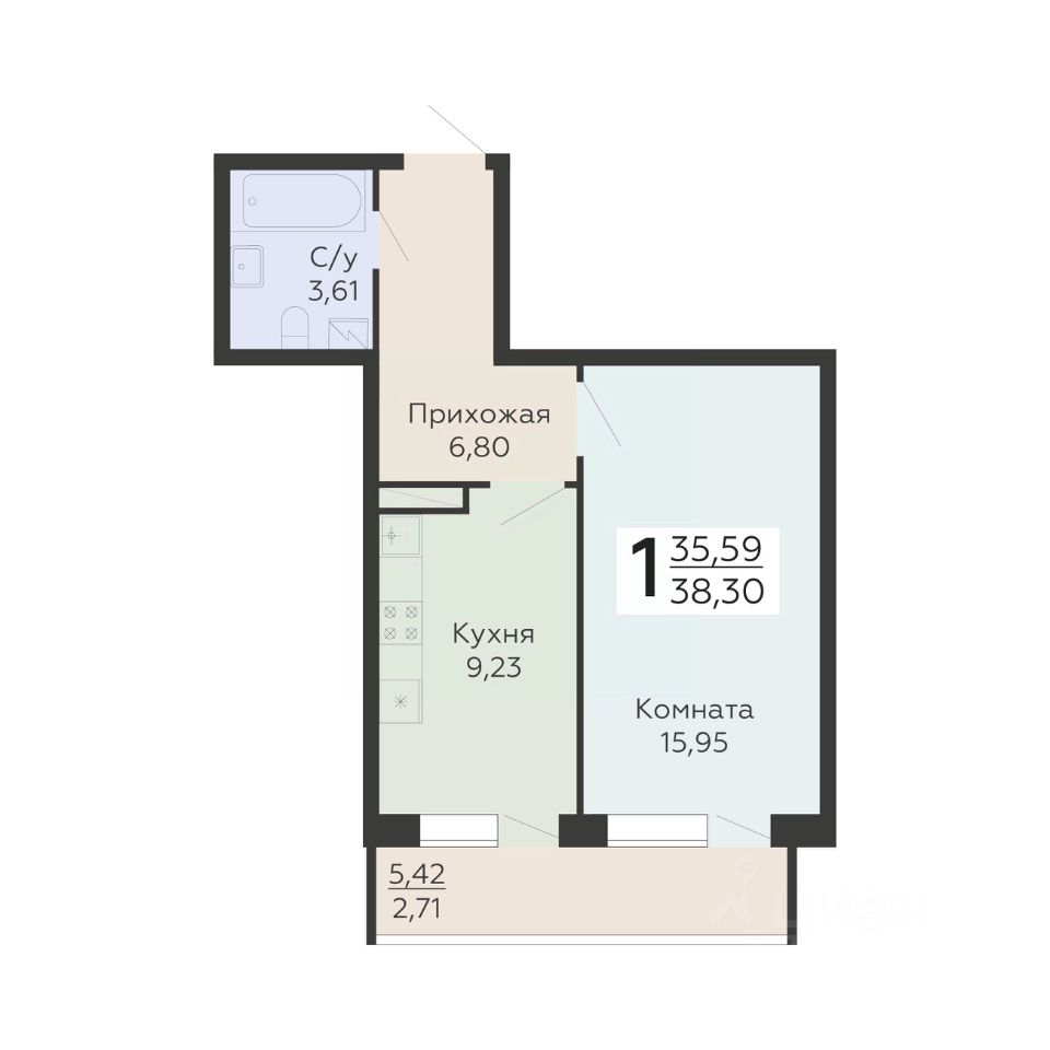 Общая площадь38,3 м2