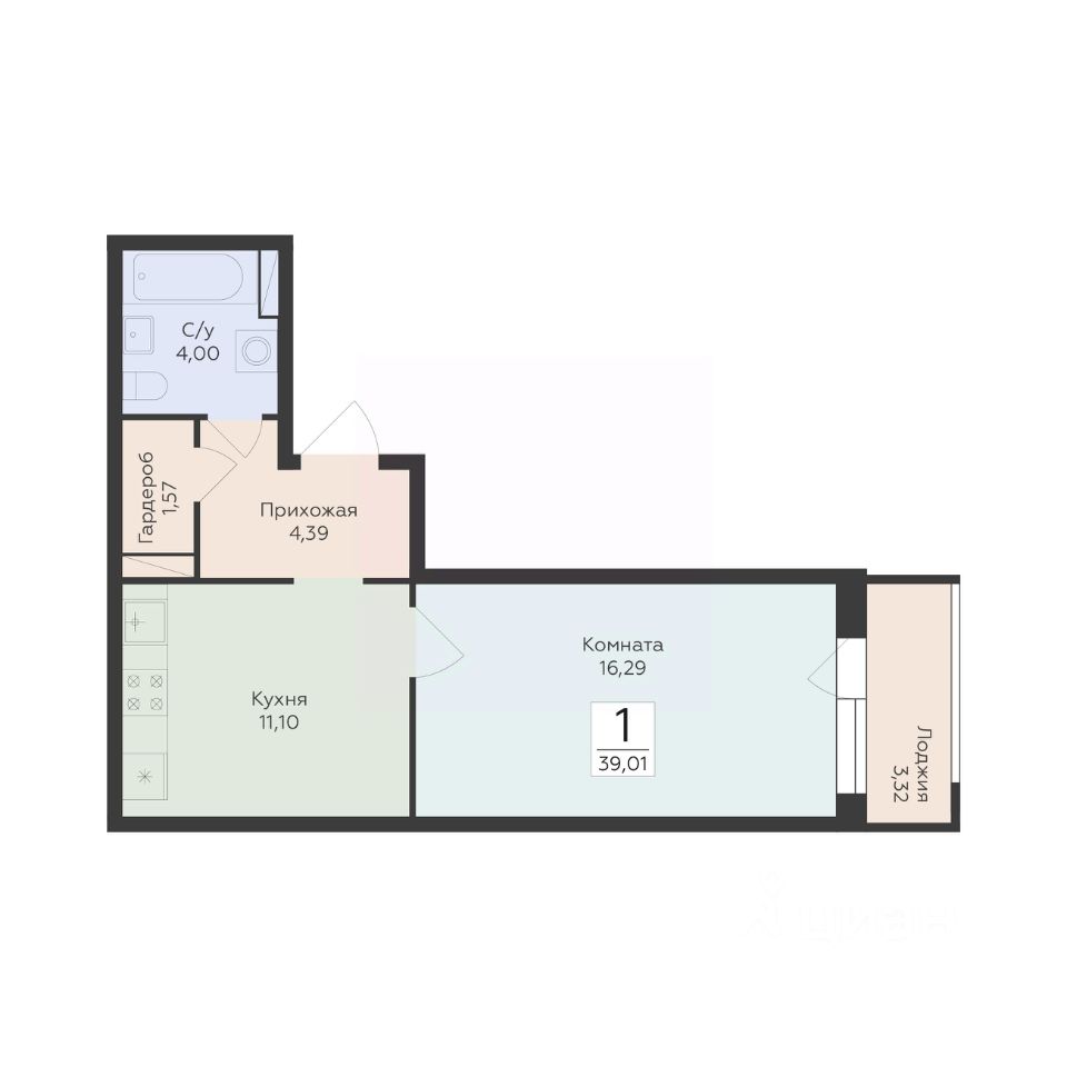 Общая площадь39,01 м2