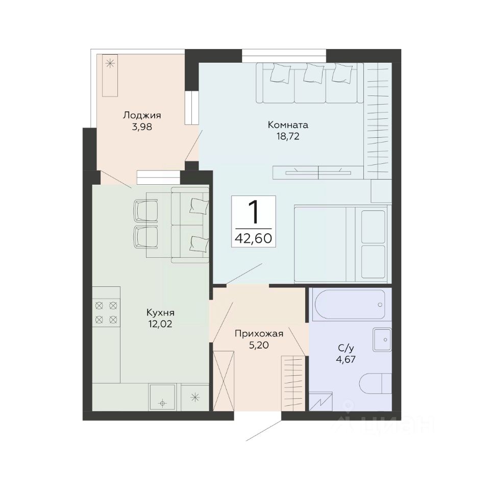Продаётся 1-комнатная квартира в строящемся доме (1 этап), срок сдачи: IV-кв. 2029, общей площадью 42.6 кв.м., на 8 этаже. Новый жилой комплекс от группы компаний ''Развитие'' расположен по адресу: г. Воронеж, по ул. Туполева.