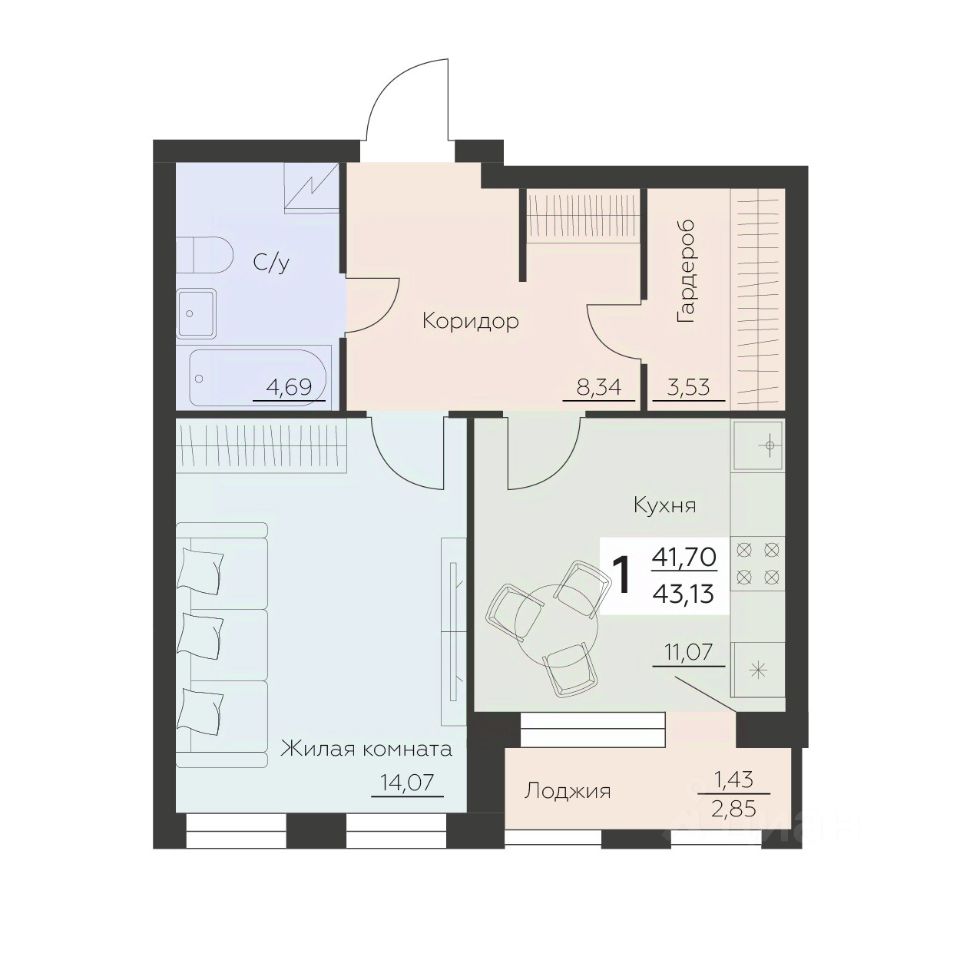 Общая площадь43,13 м2