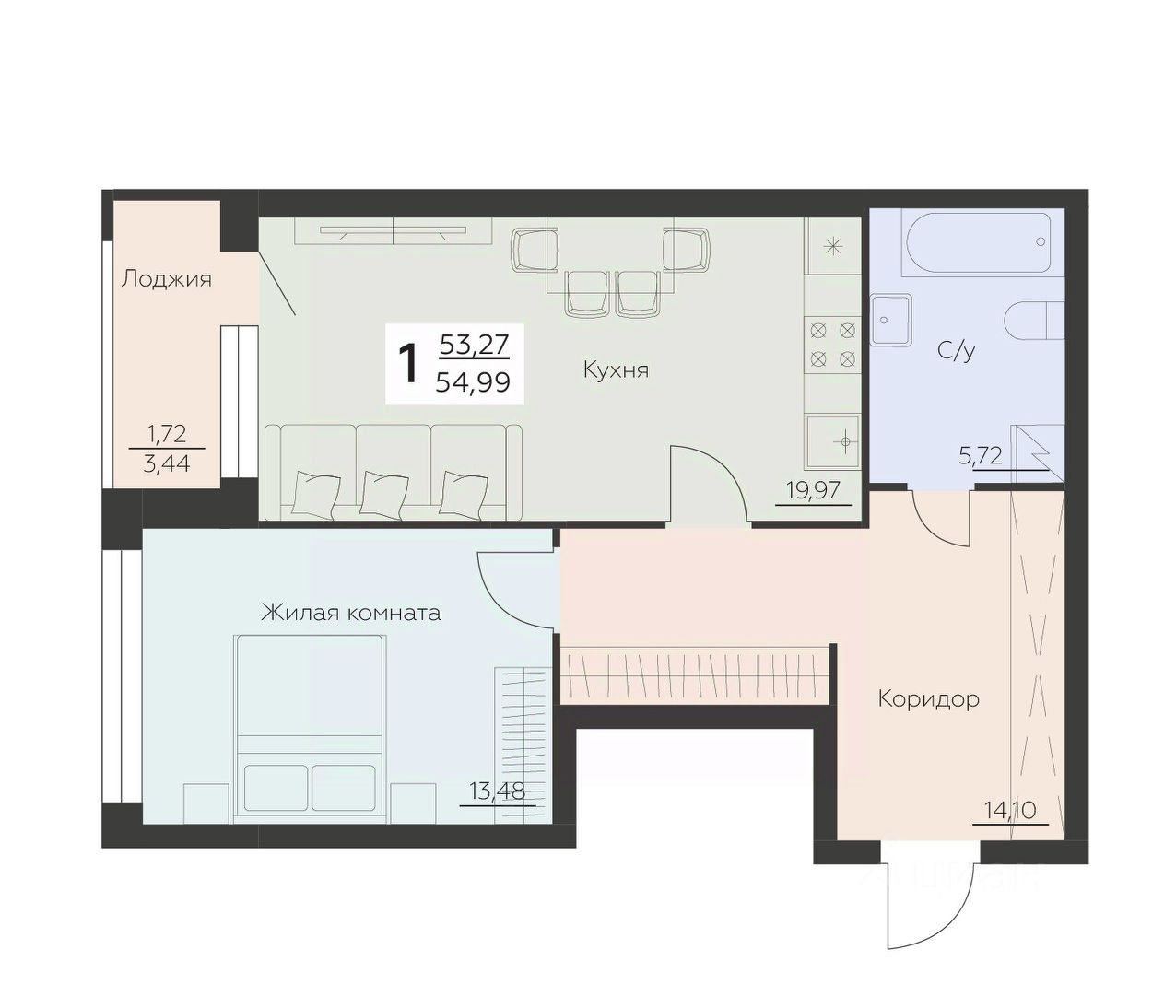 Общая площадь54,99 м2
