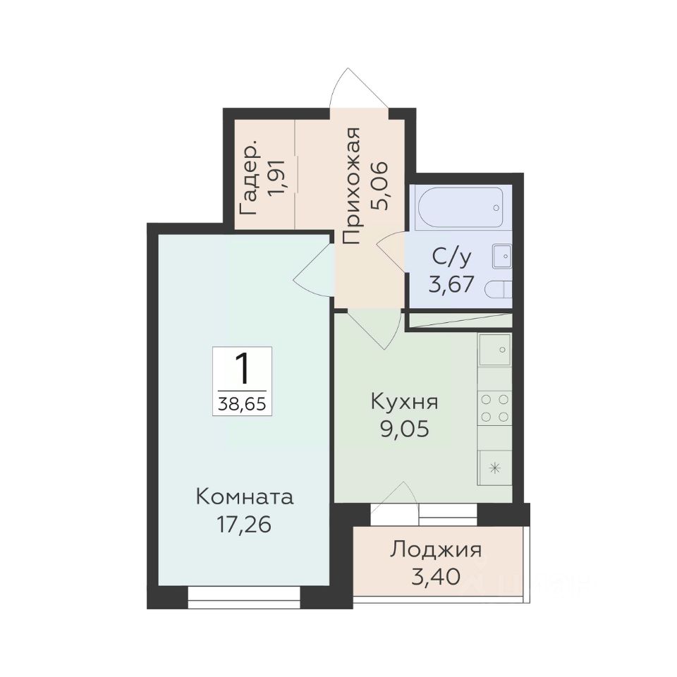 Общая площадь38,65 м2