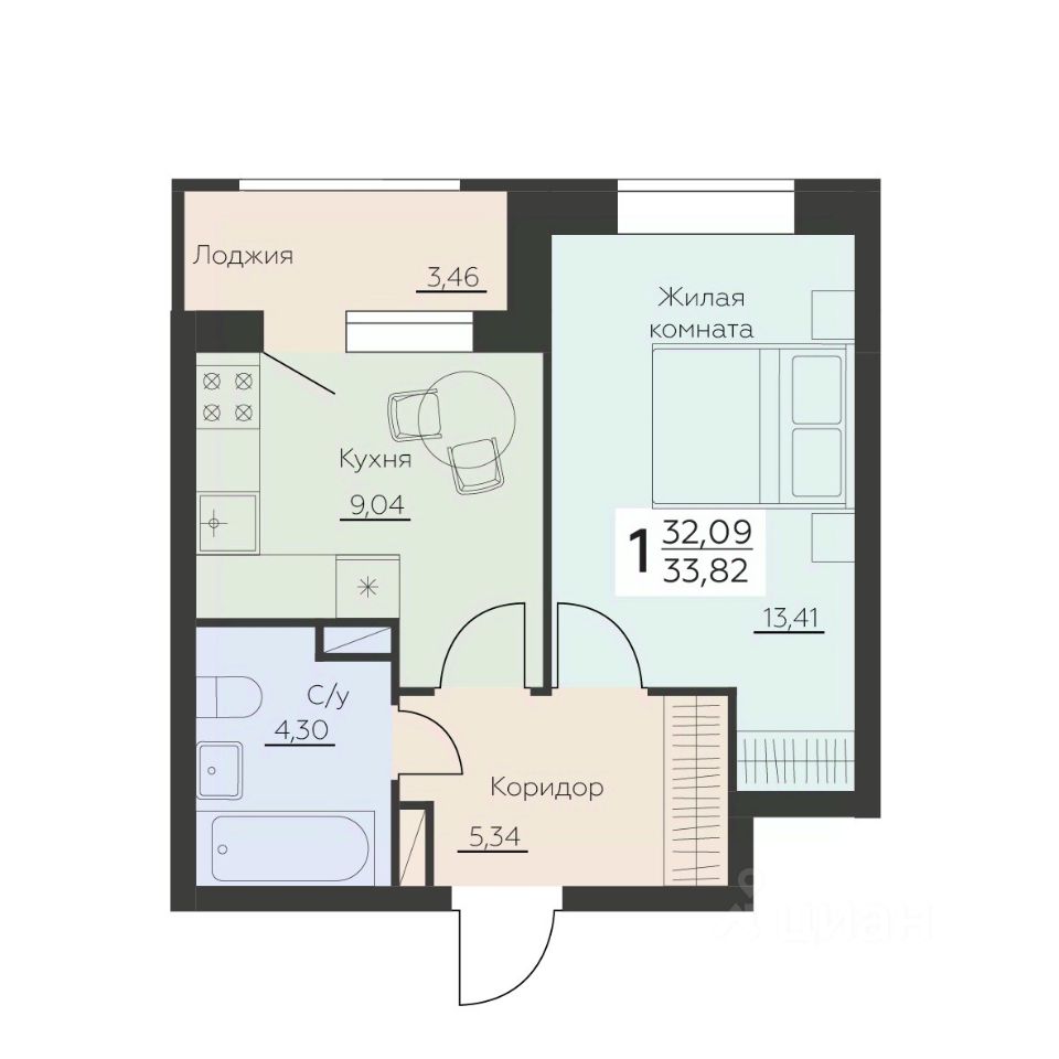 Общая площадь33,82 м2
