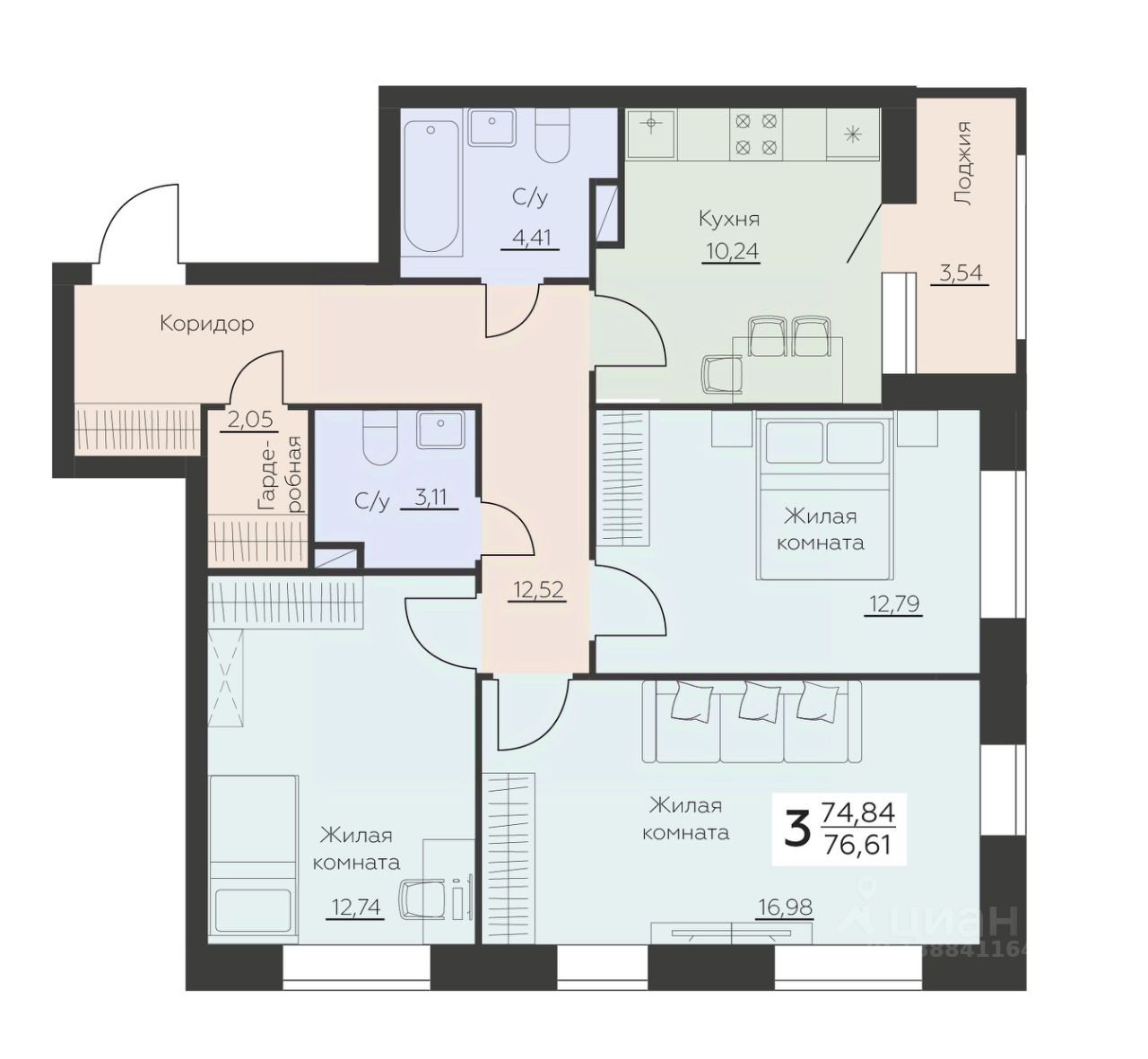 Общая площадь76,61 м2